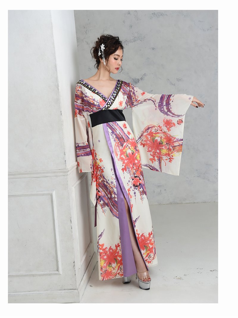 華やか和柄シフォン着物ドレスキャバクラ花魁ロングドレス【流遊】(S/M/L/XL/XXL)(ベージュ) [500570]