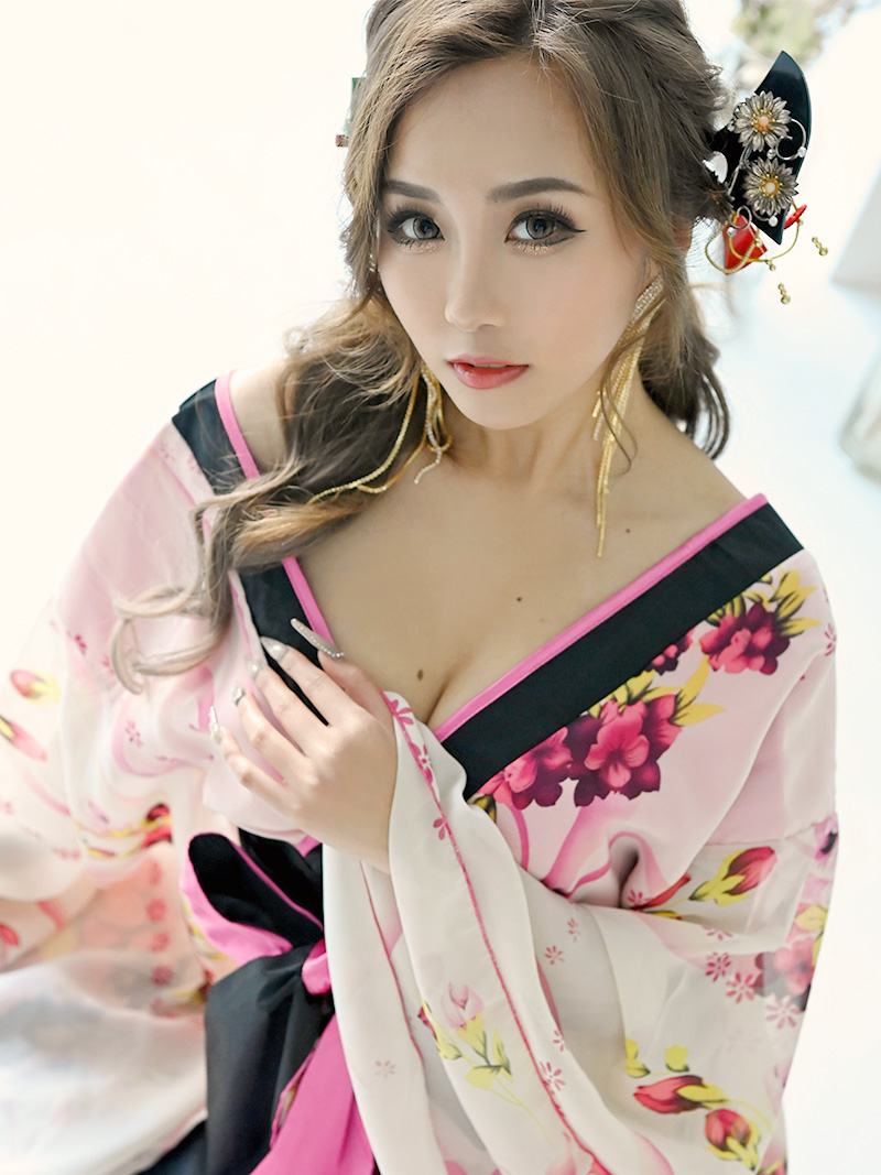 花柄 中ミニ 花魁 着物ドレス 和柄 流遊(S/M/L/XL)(ピンク/グリーン/パープル) [504565]
