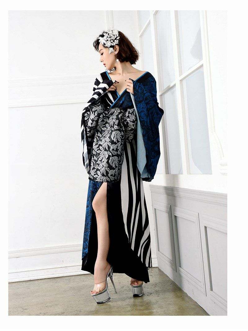 ☆和洋MIXのゼブラ柄×ペイズリー柄の半身柄がオシャレな着物ドレスは谷間魅せも出来る妖艶な雰囲気の和風ドレス。