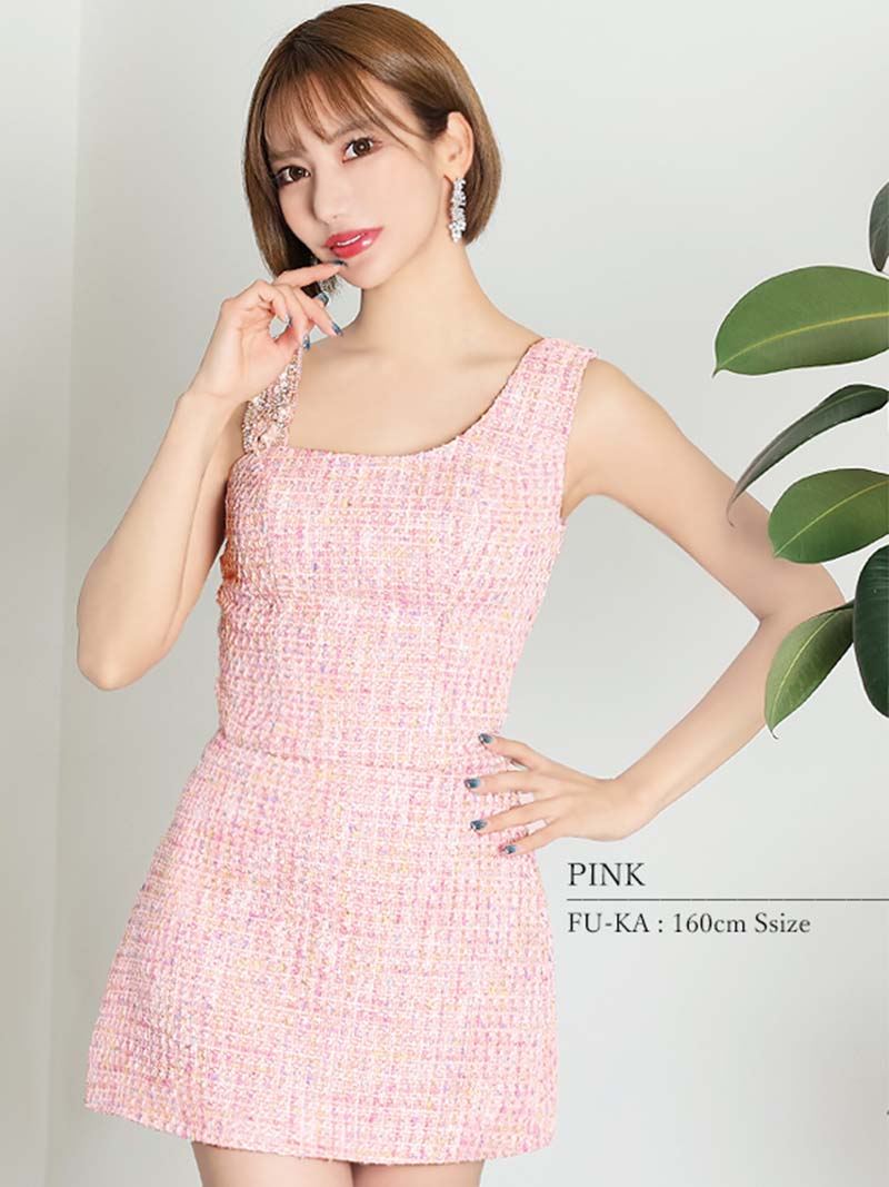 セットアップ キャバ ドレス ツイード セットアップ アシンメトリー ビジュー 2ピース AngelR(S/M)(ホワイト/ピンク/ブルー)