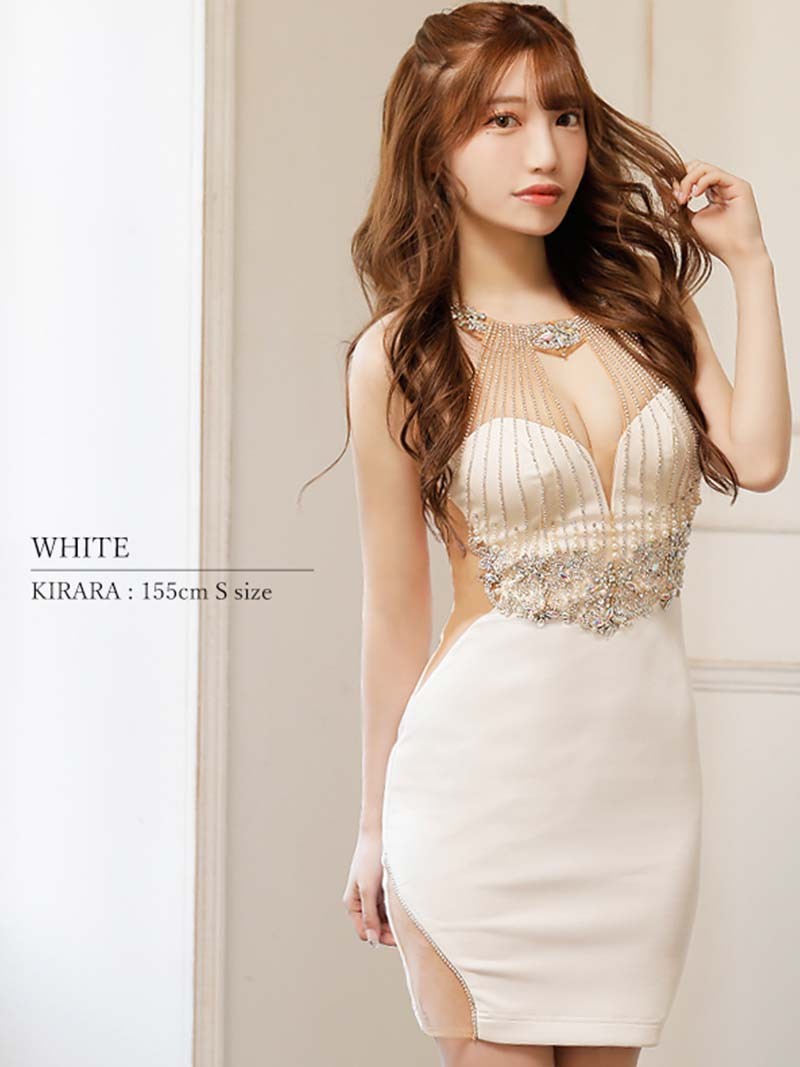 ☆デコルテラインで煌めくビジューが顔周りを華やかにして品格ある優美な印象を与えるキャバドレスです。