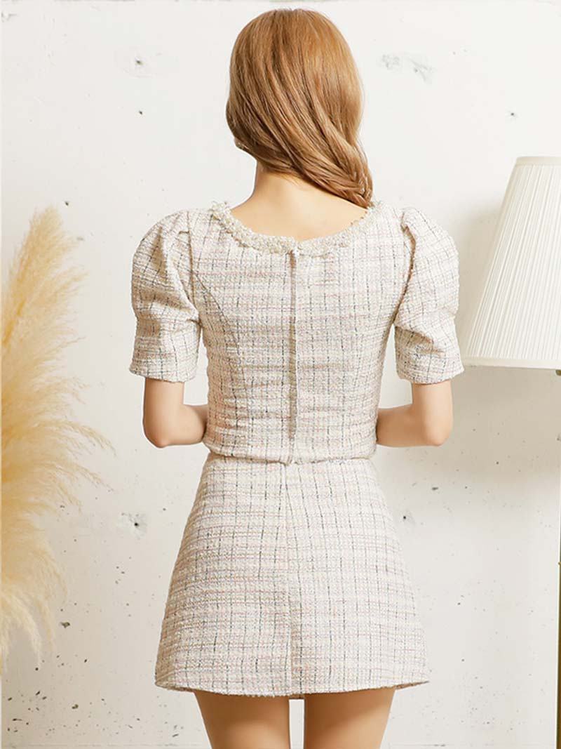 ☆ツイード素材にトレンド感あふれるパフスリーブのセットアップはパールビジューが華やかに映える高級ブランドドレス。