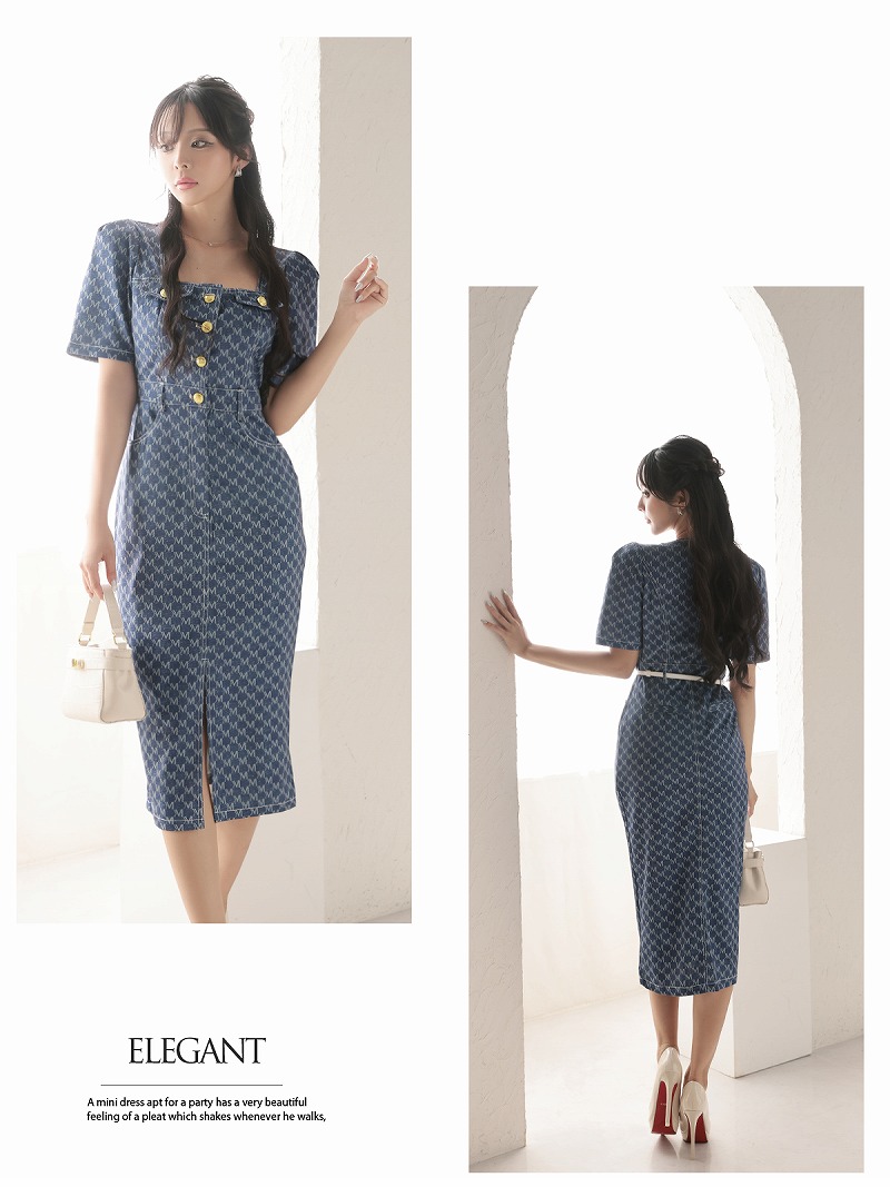 ☆上品なデニム素材で仕立てた膝丈の韓国ワンピースで、大人っぽくおしゃれな印象の韓国ワンピース。