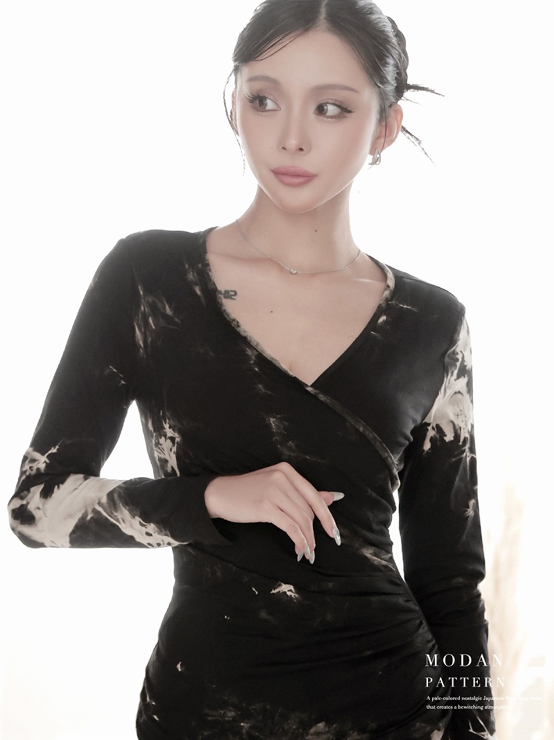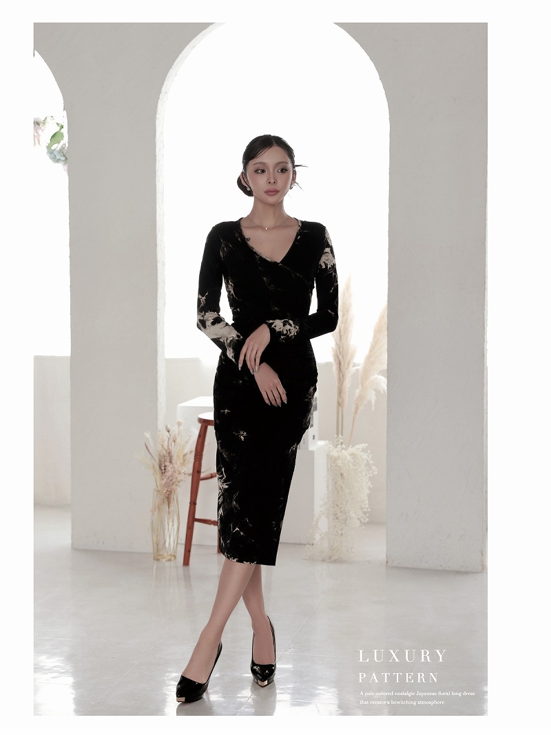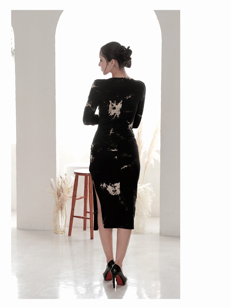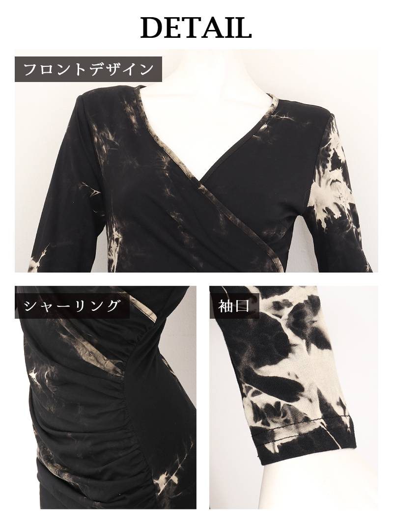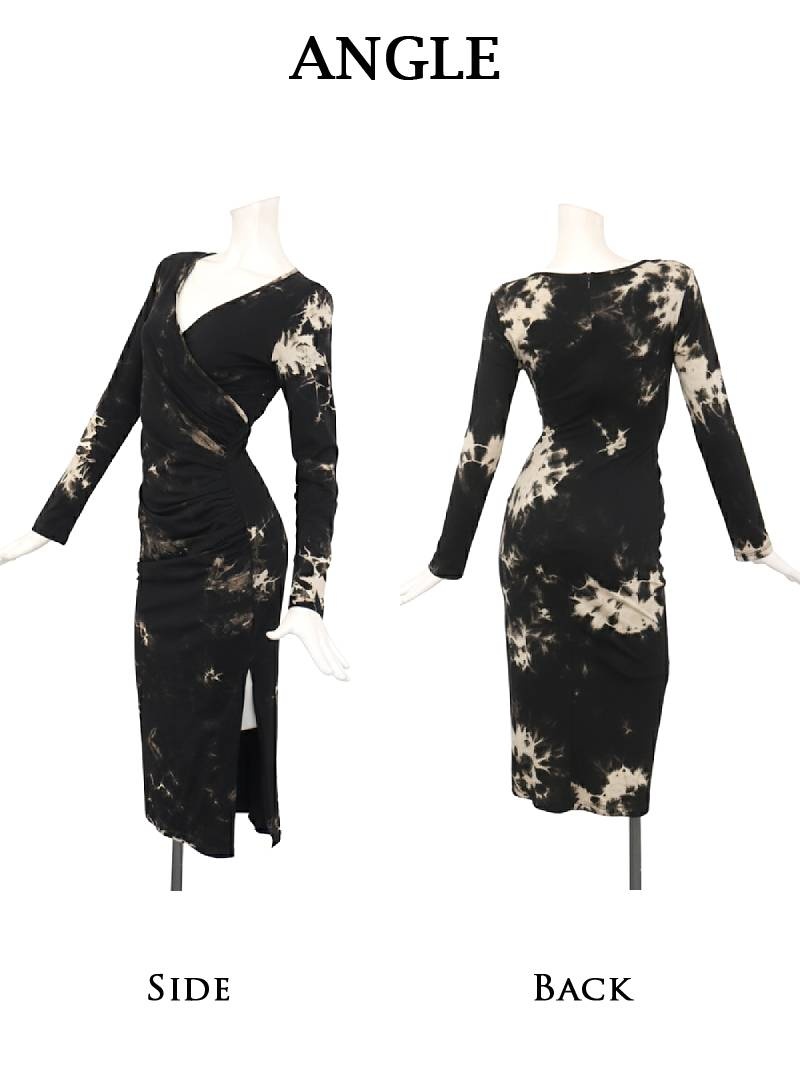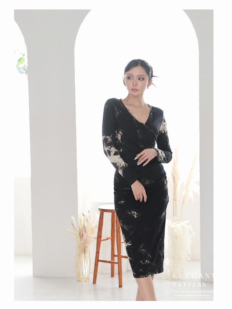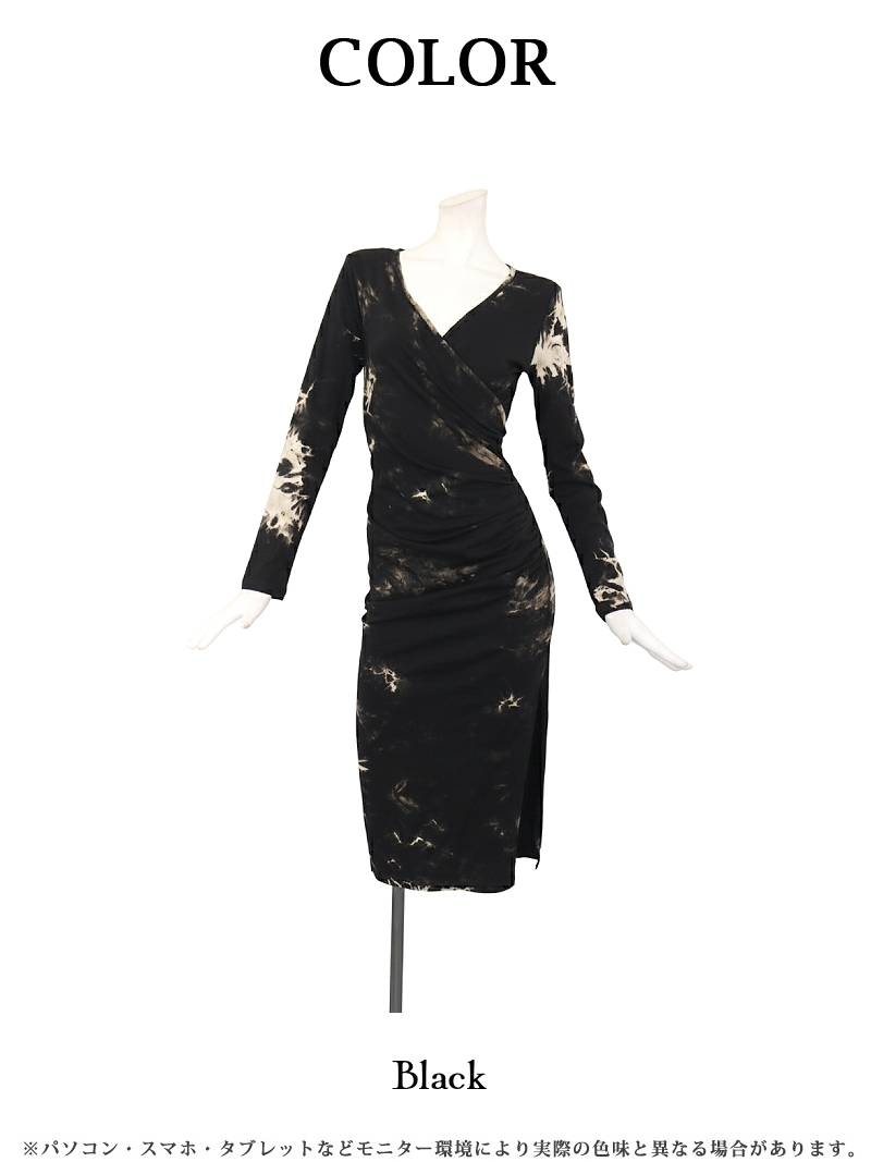 ワンピース キャバドレス タイダイ風 ストレッチ 長袖 膝丈 カシュクール DaysPiece(S/M/L/XL(2L))(ブラック) [510107]