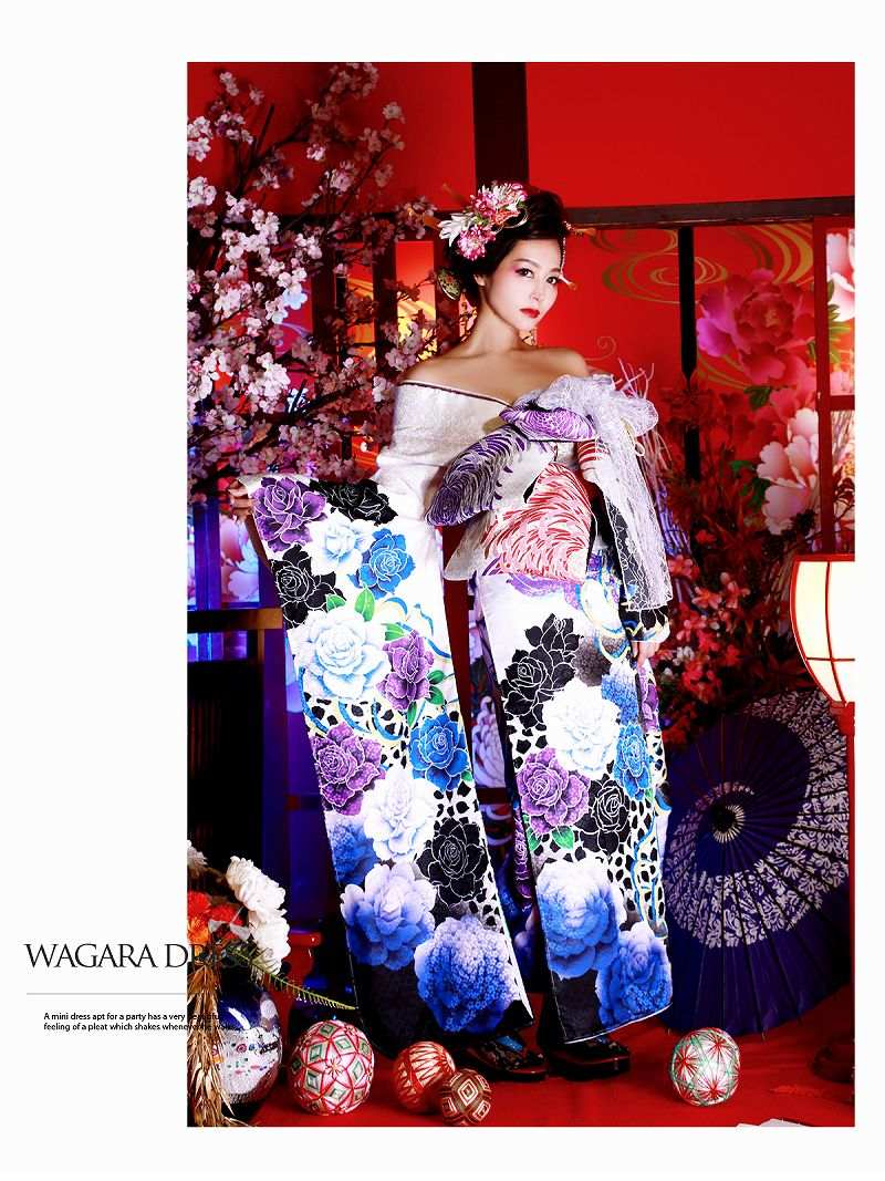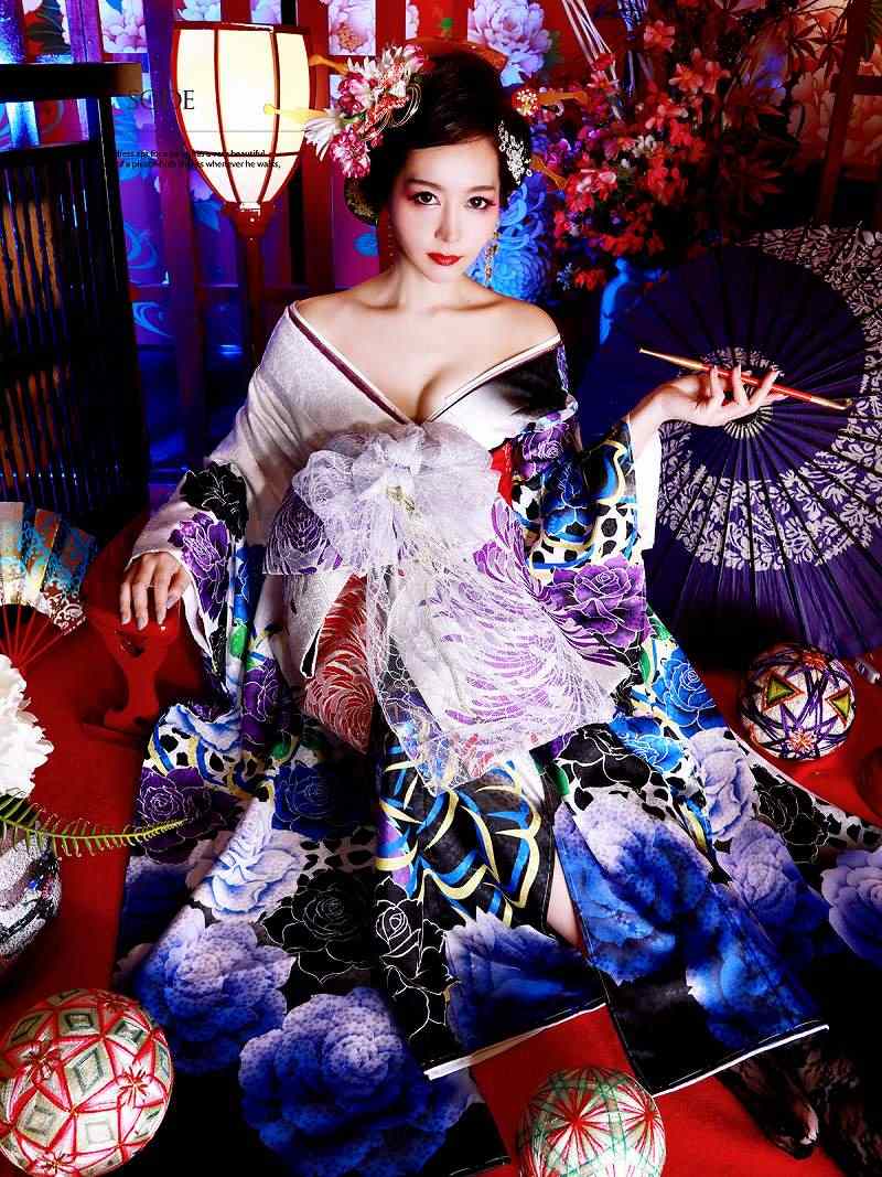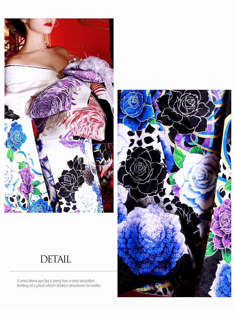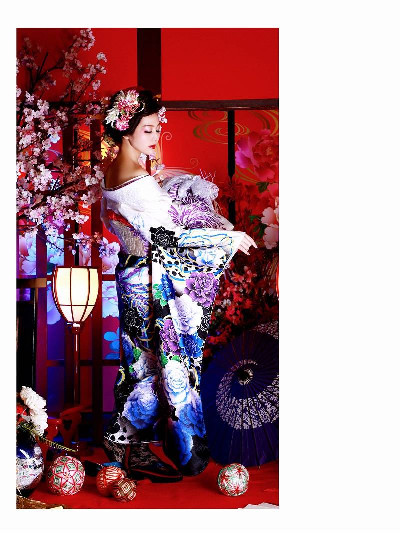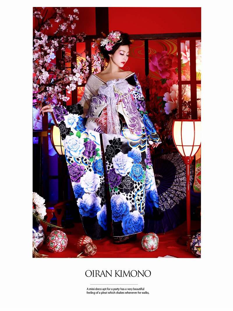 ☆迫力のある大輪の薔薇のふりそでに乱れ菊が施された帯が個性を放つ花魁着物は一着で目立つ豪華なおしたて振袖。