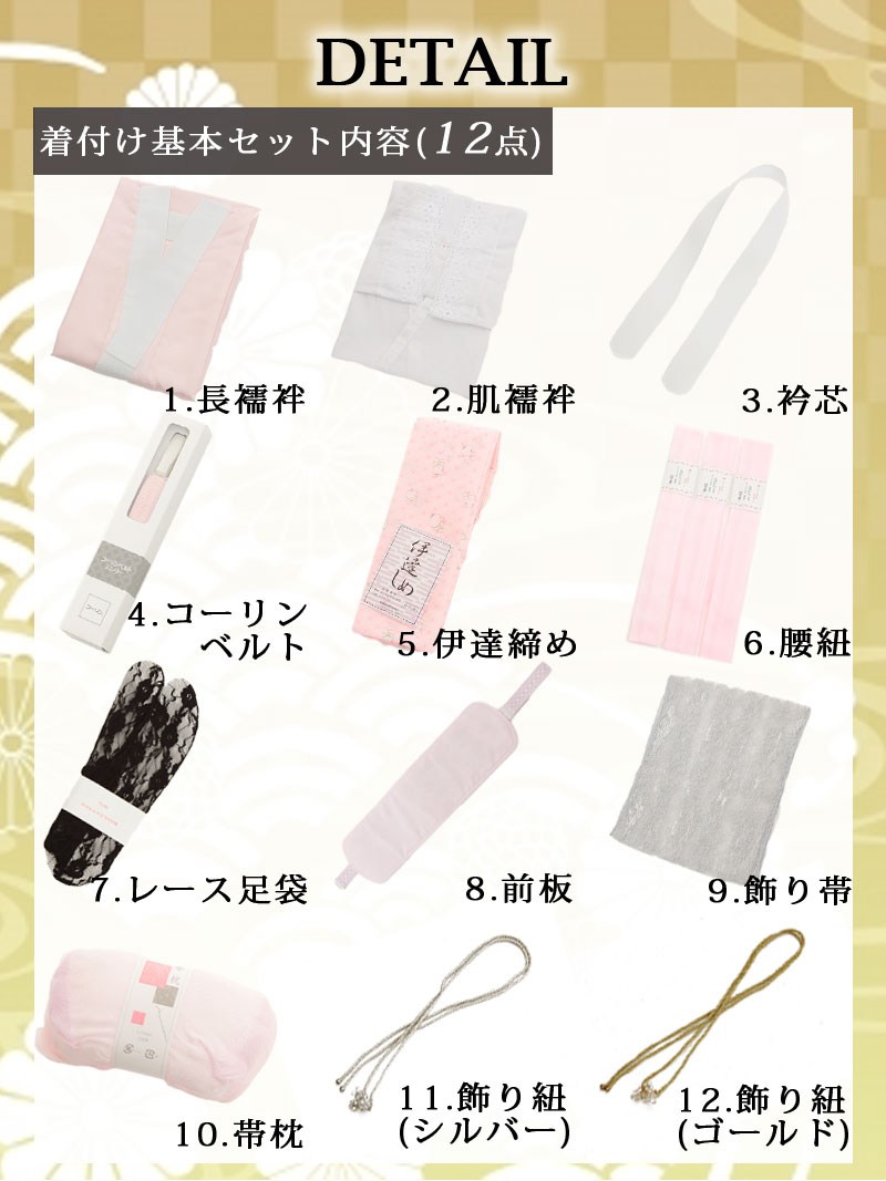 内容:長襦袢・肌襦袢、衿芯、コーリンベルト、伊達締め、腰紐、レース足袋、前板、飾帯、帯枕、飾り紐2色