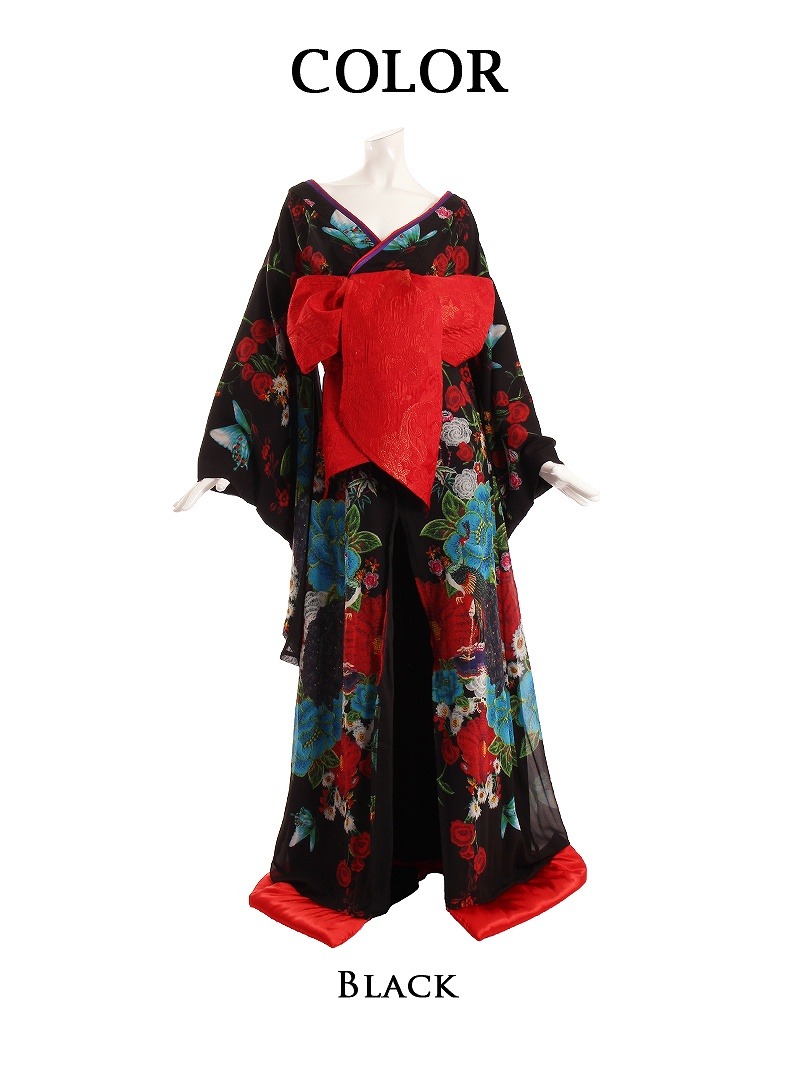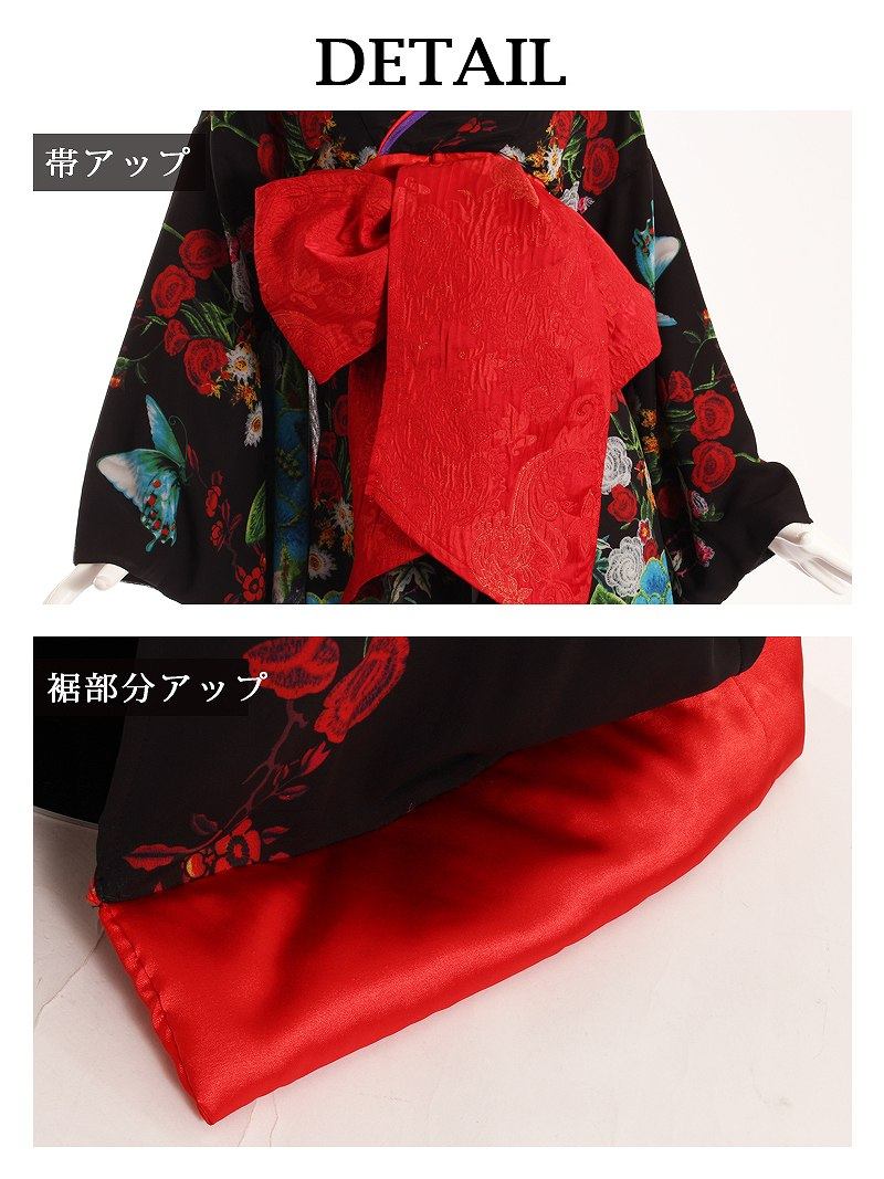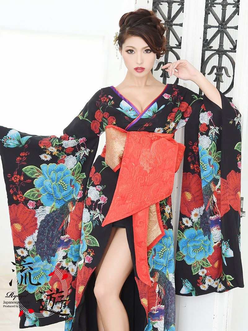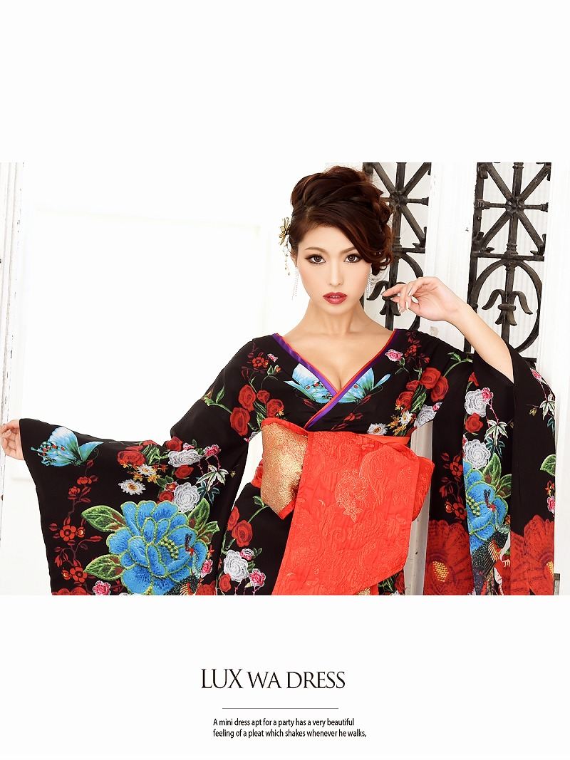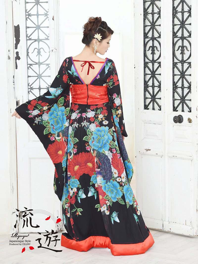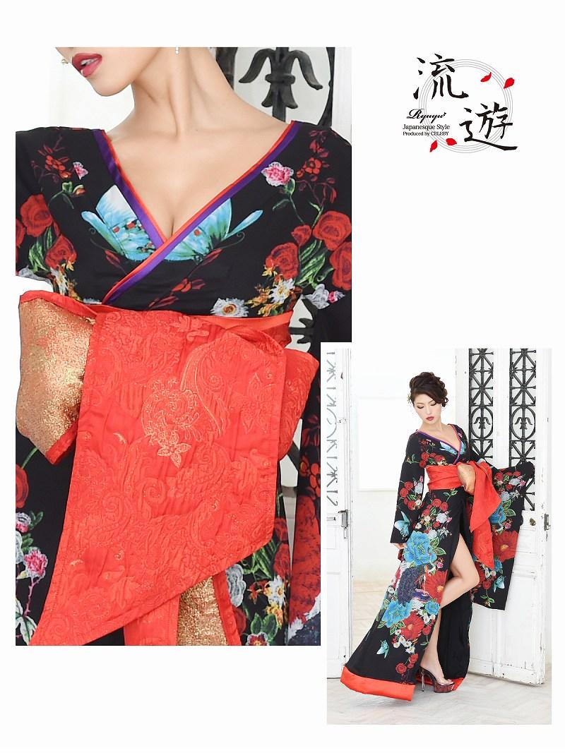 キャバドレス 和柄 着物ドレス 花魁 和柄 黒 ダンス衣装 流遊(M/L)(ブラック) [504251]
