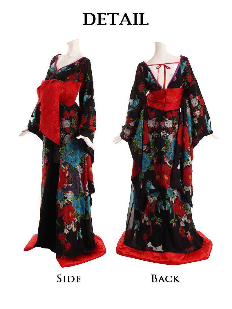 ☆裾には本格的な遊女の風格を出す中綿入りの花魁ドレスは帯を前で結んでいただくと簡単に花魁姿になれる和柄ロングドレス。