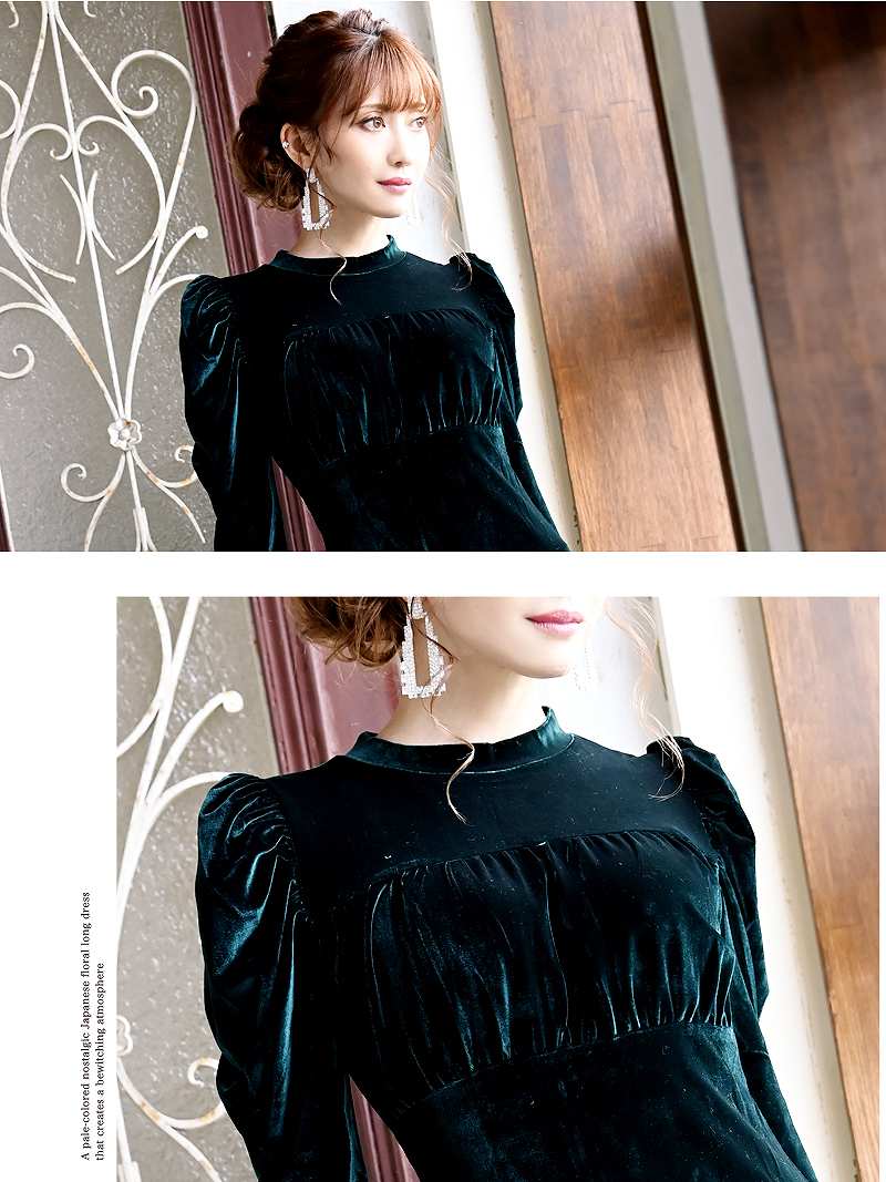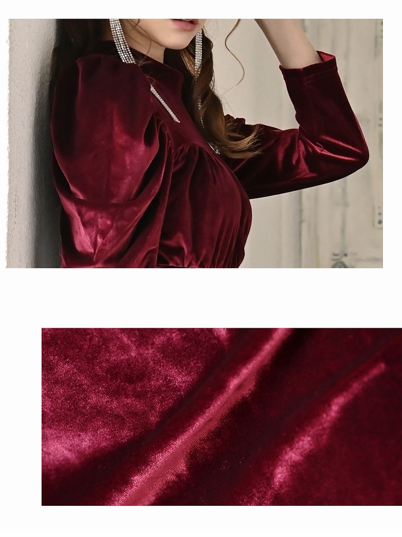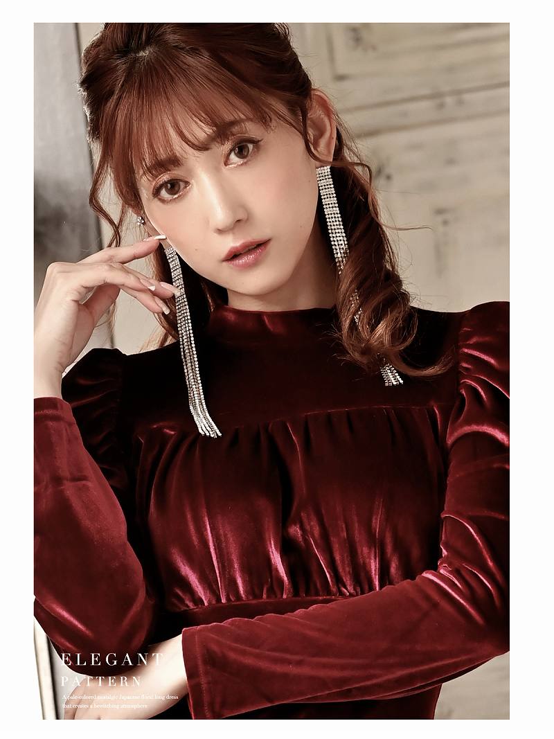 ☆ドレッシーで高貴なムードを演出するベロアドレスはパワーショルダーの長袖となっており二の腕をカバーしながらクラシカルな雰囲気もプラスするエレガントキャバドレス。