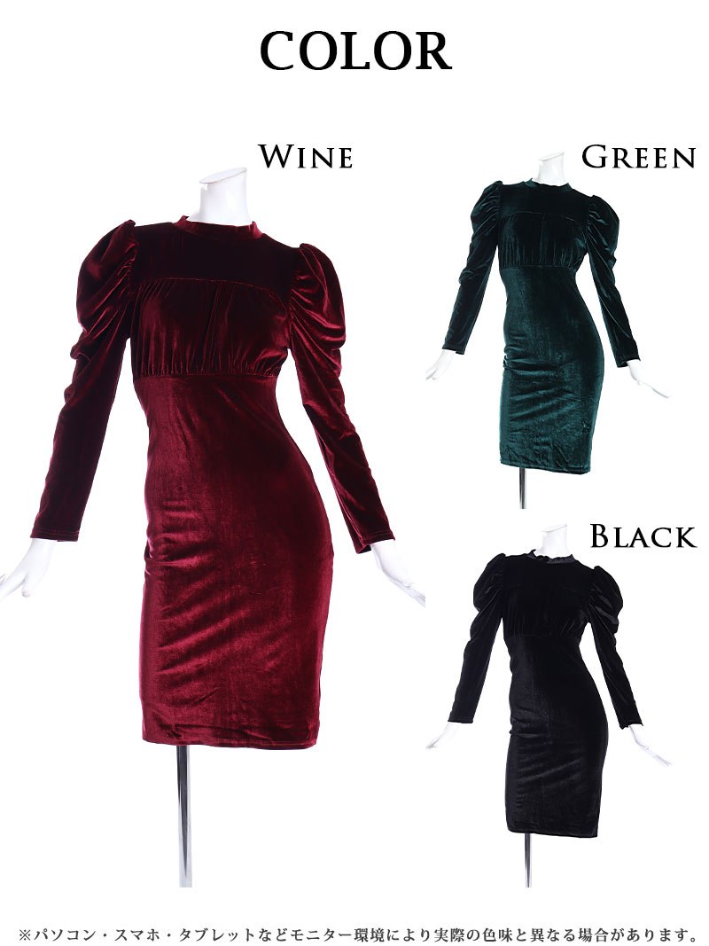 キャバドレス ミニ 袖付き 長袖 パーティードレス ワンカラー ハイネック Belsia(S/M/L/XL(2L))(ワイン/グリーン/ブラック)