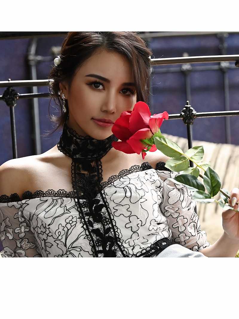 ☆美しいレースが施されたオフショルデザインが、デコルテを優雅に演出。女性らしさを引き立てつつ、セクシーさも兼ね備えた魅力的なスタイルを実現します♪