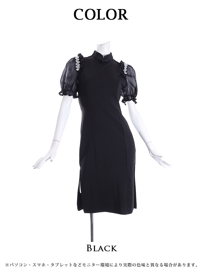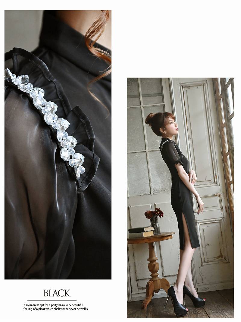 キャバドレス ミニ 半袖 ワンカラー ハイネック ミモレ丈 キャバ嬢 Belsia(S/M/L)(ブラック) [509615]