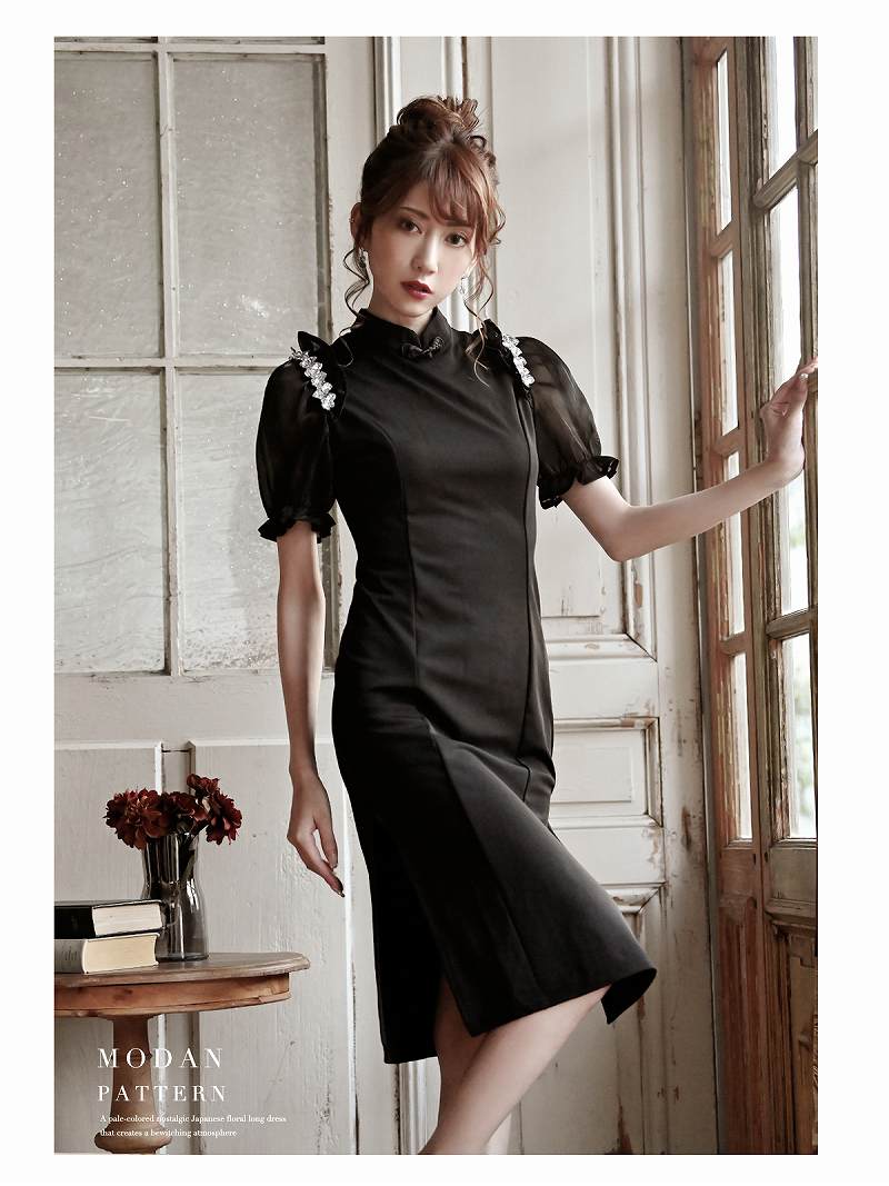 ☆半袖のパフスリーブがエレガントで、ミモレ丈で落ち着いたセクシーさを演出。