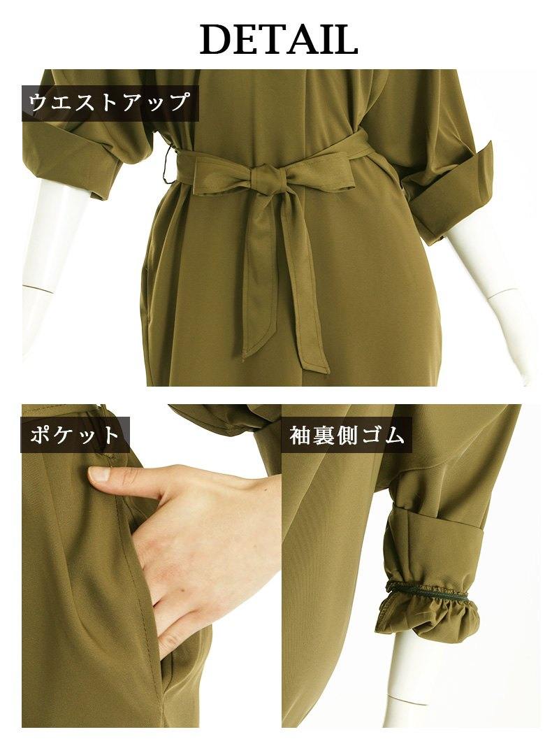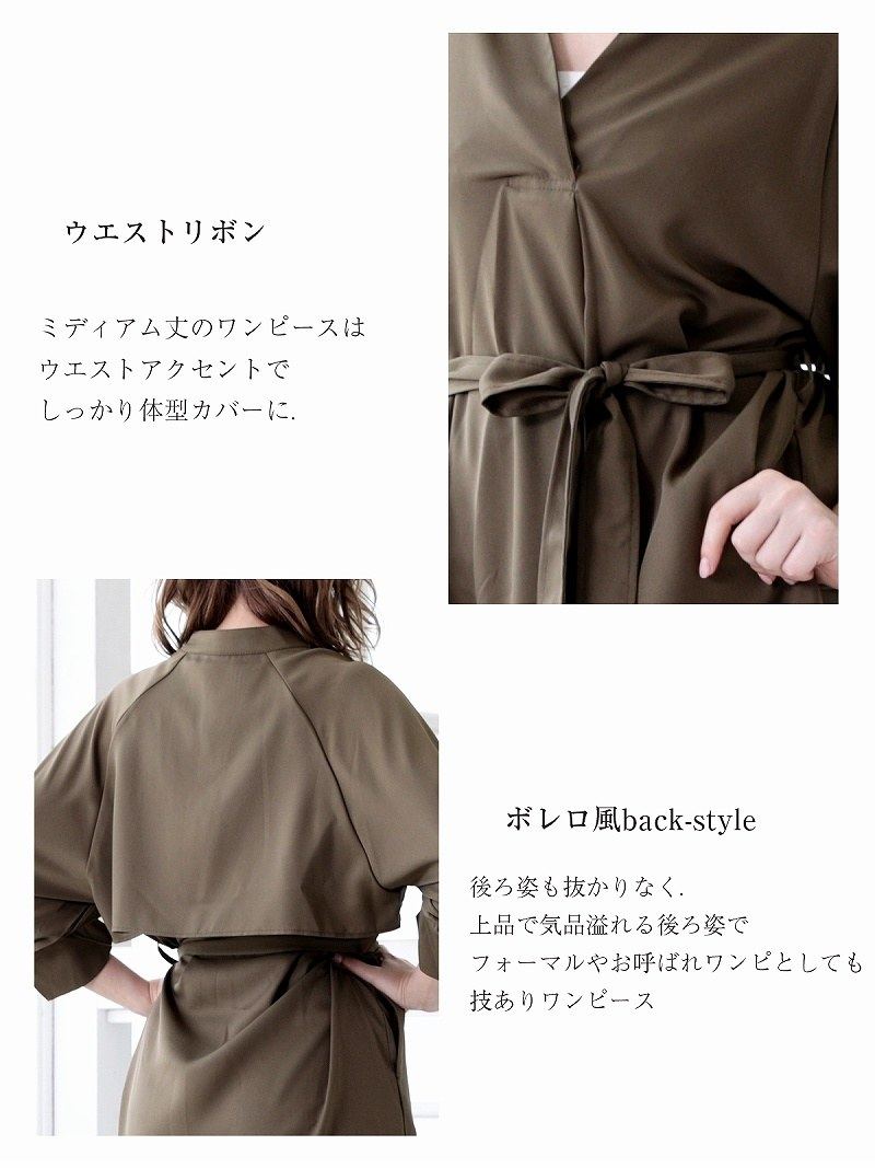 ☆ウエストリボンでシルエットを美しく整え、五分袖の袖付きデザインがエレガント。