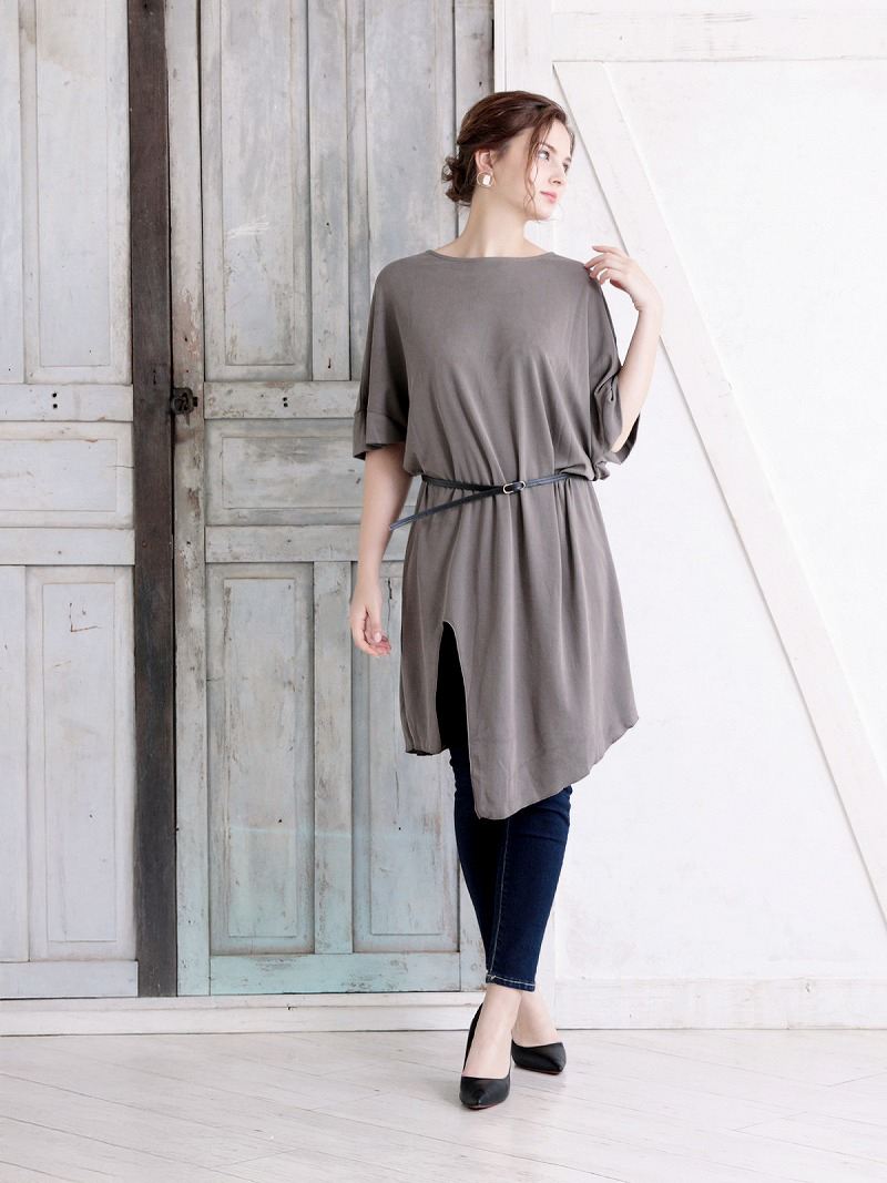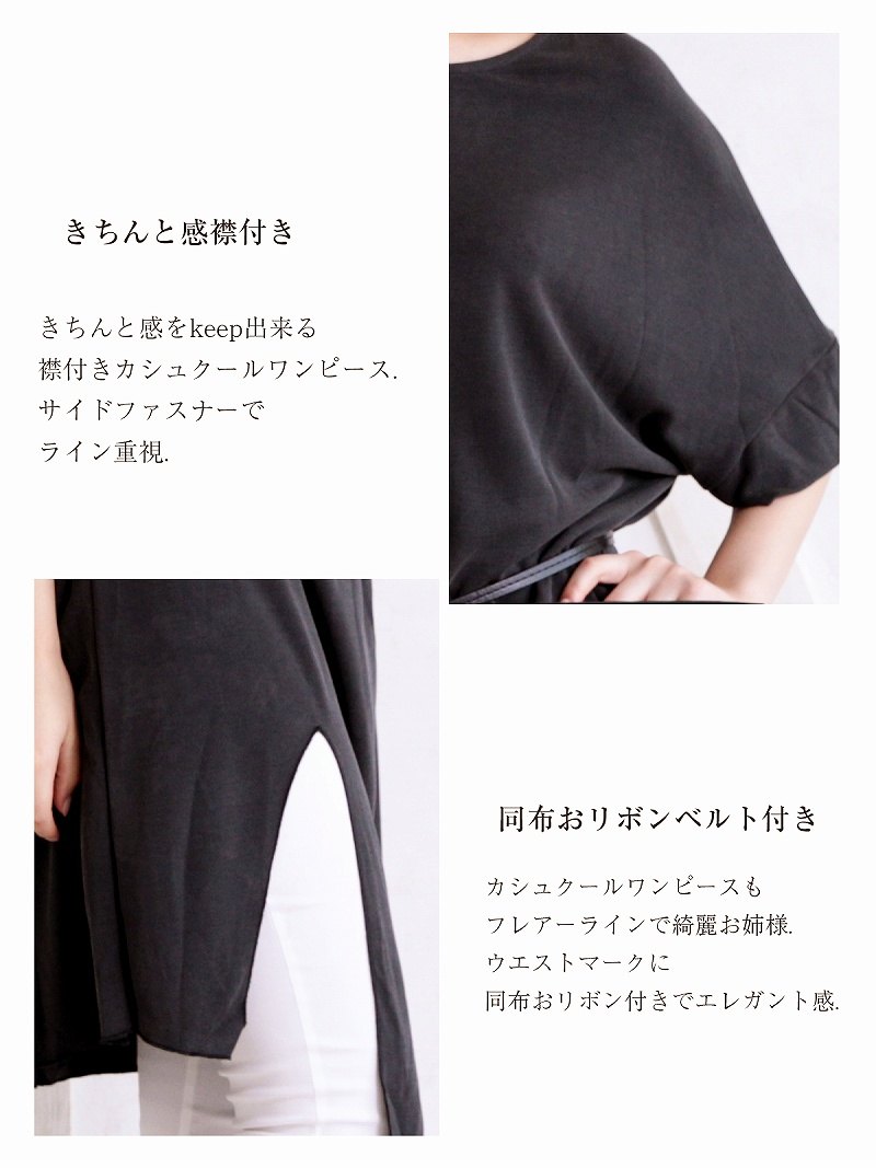 ☆ベルト付きでウエストラインを美しく見せつつ、体型カバーにも最適。パーティードレスとしても活躍する、大人の女性にぴったりの一着です。