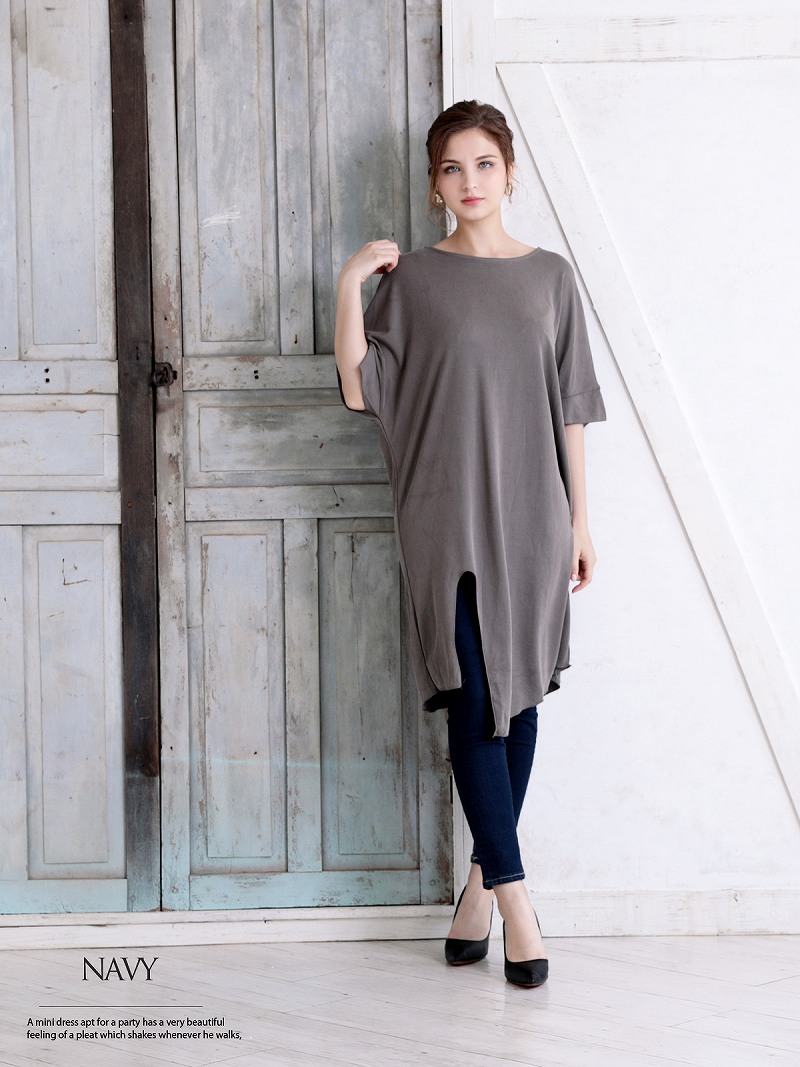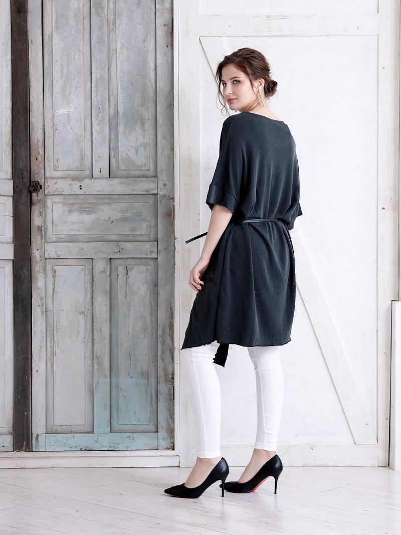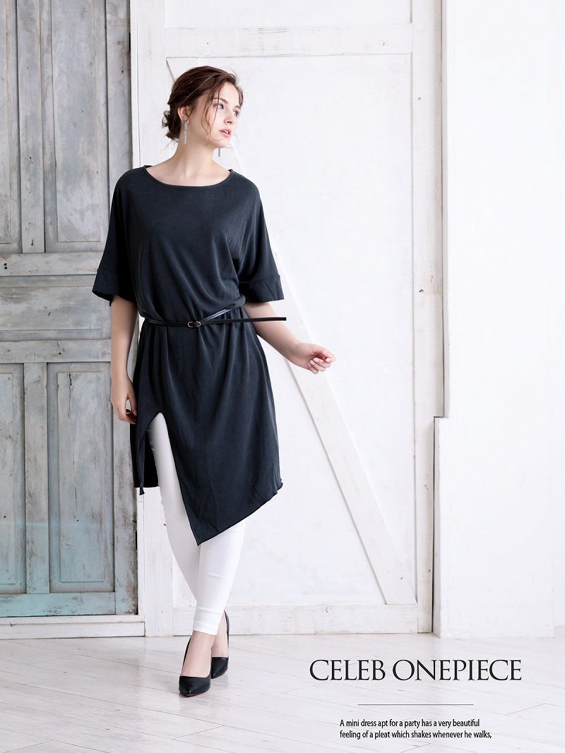 ☆アシンメトリーデザインが目を引く、LAスタイルの袖付きキャバワンピース。ドルマンスリーブと五分袖の組み合わせがゆったり感を演出し、無地仕上げで洗練された印象に。