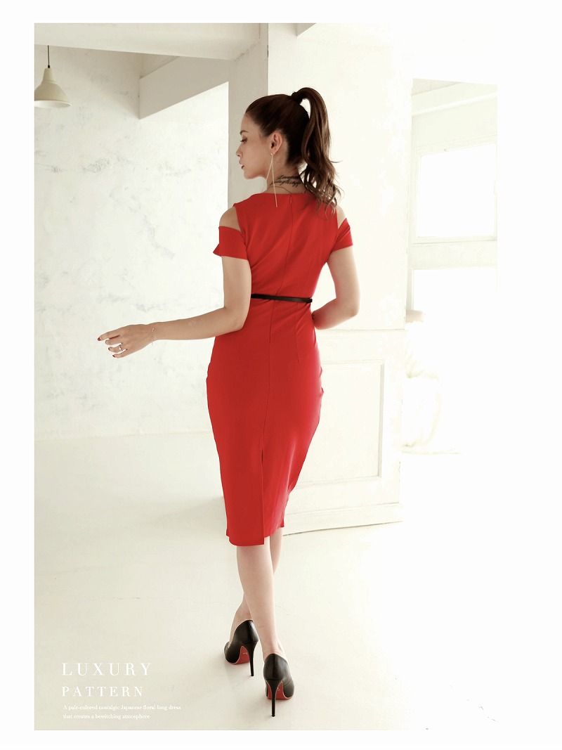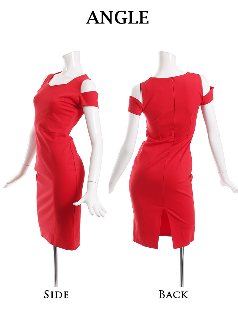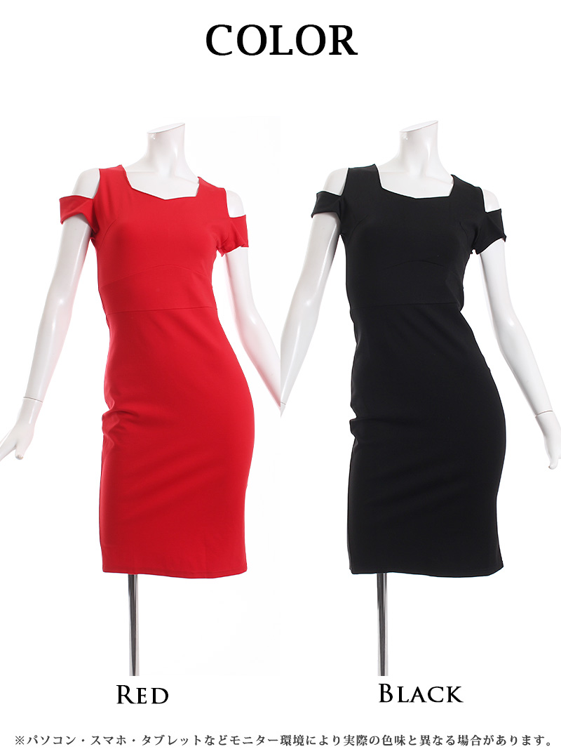 ワンピース キャバドレス ワンカラー オープンショルダー ボディライン ペンタゴンネック 膝丈 DaysPiece(S/M/L/XL(2L))(ブラック/レッド)