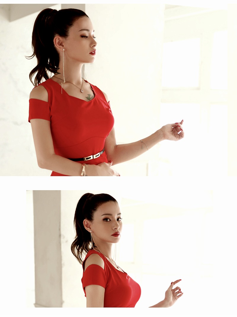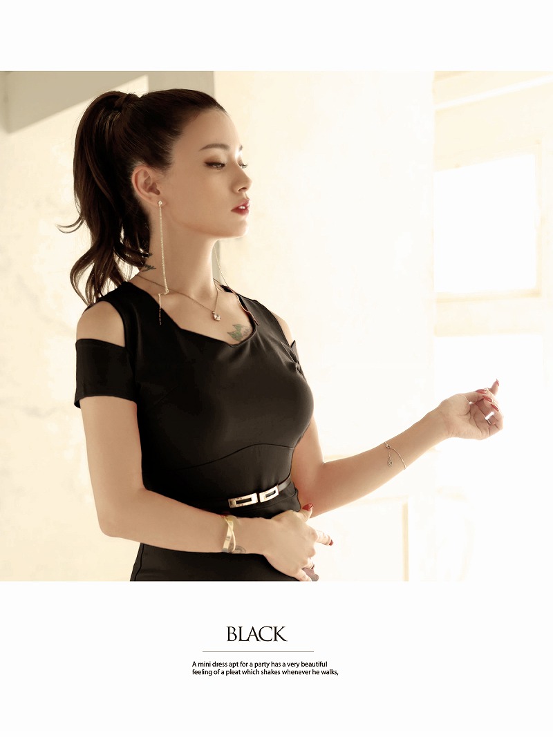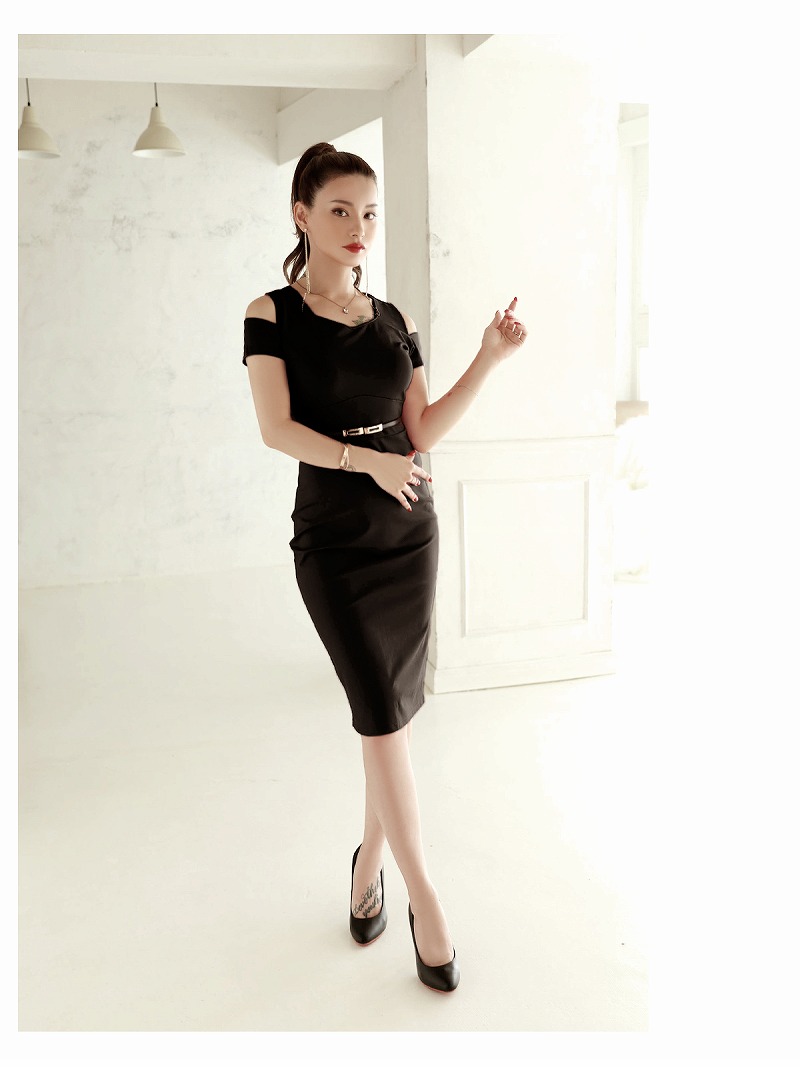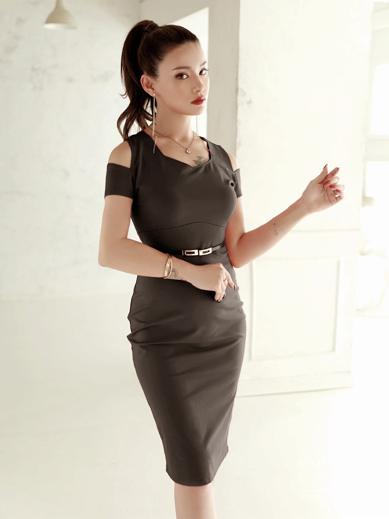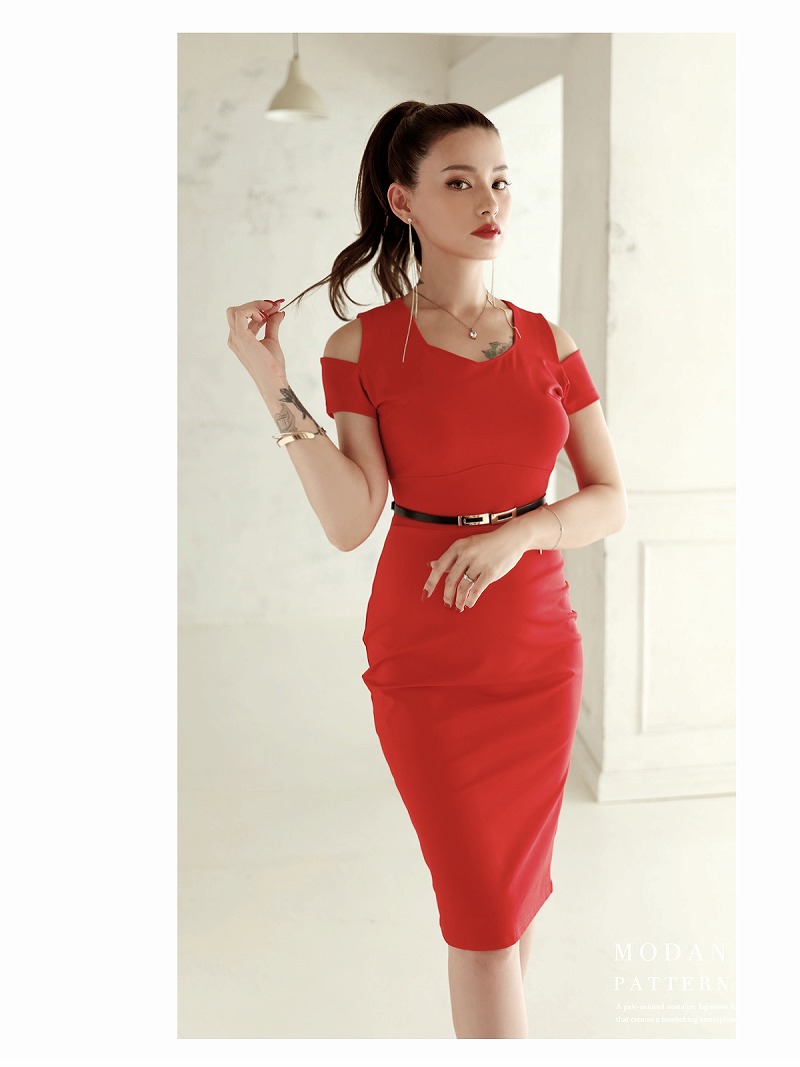 ☆シンプルでセクシーなワンカラーの韓国キャバワンピース。オープンショルダーで魅力的な肩見せを演出し、ボディラインを美しく引き立てます。