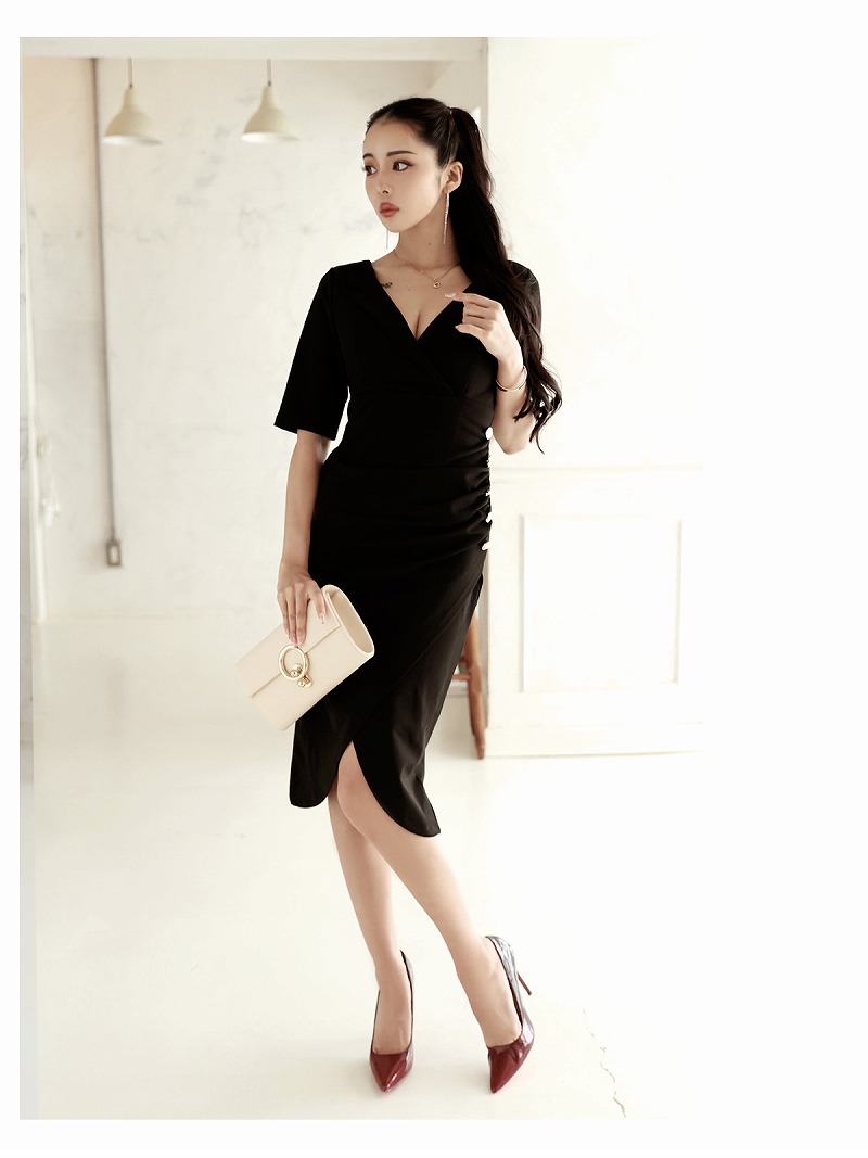 ☆カシュクールデザインとハイウエストで、スタイルを引き立てる。膝丈で上品さも感じさせる。