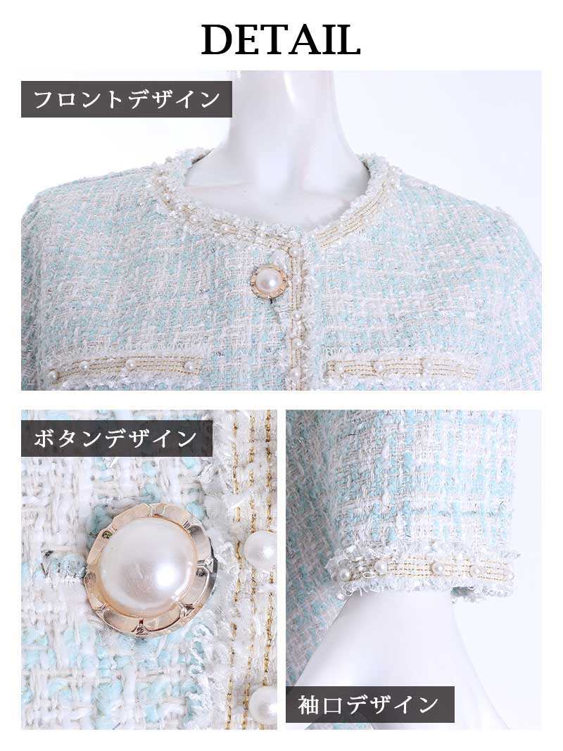 ☆ノーカラーのジャケットがスタイリッシュで、コンパニオンやママスーツにもぴったり。