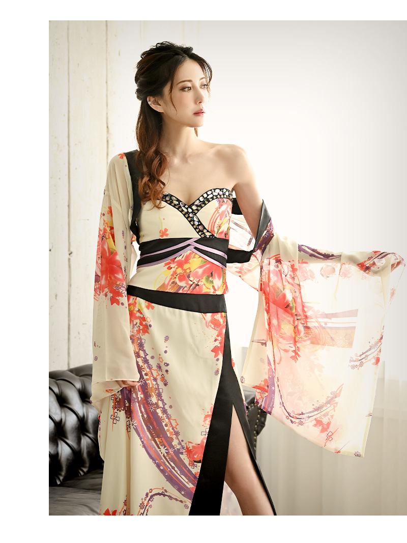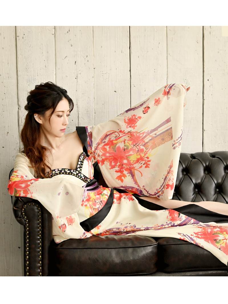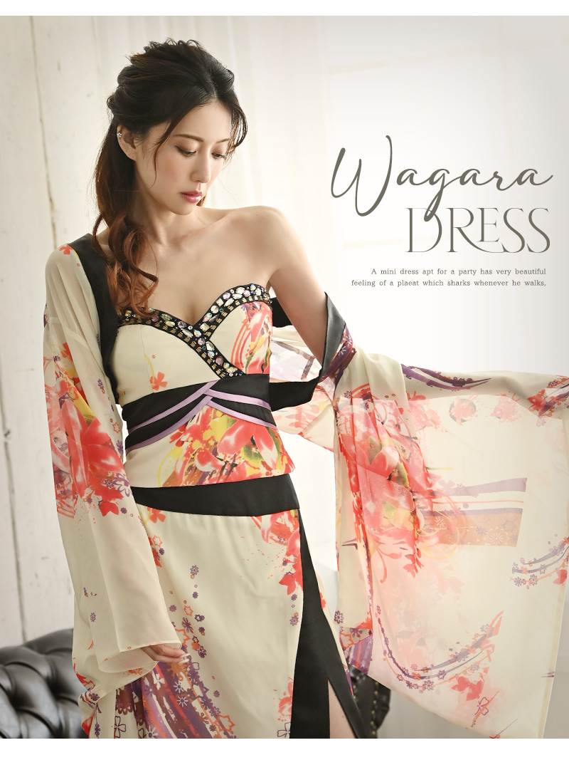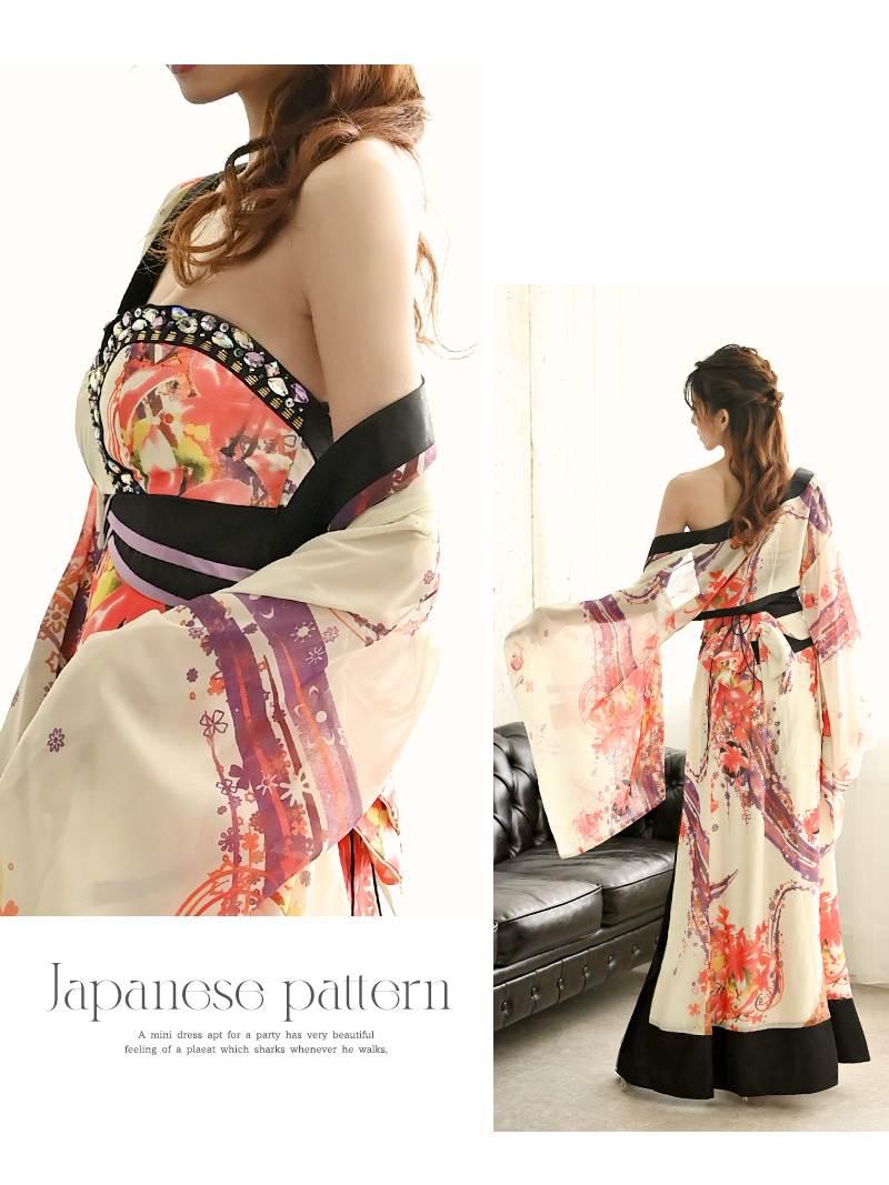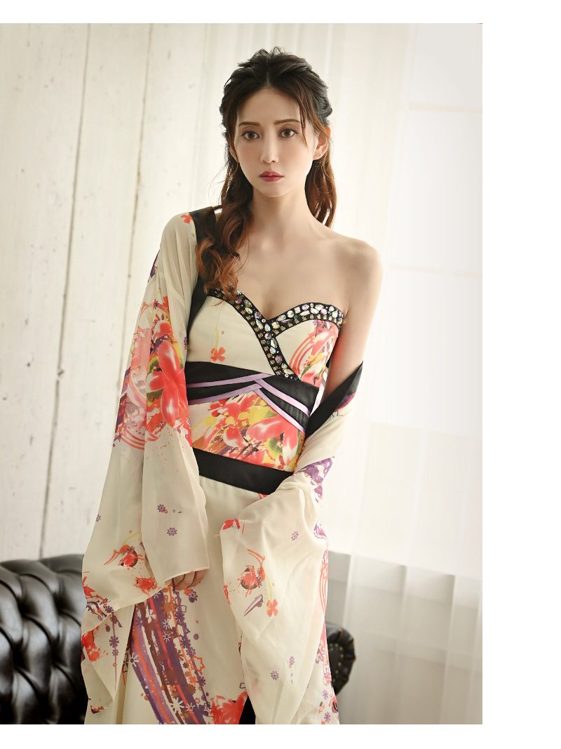 ☆妖艶なホワイトが魅力の花魁風着物ドレス。華やかな和柄とベアトップデザインがセクシーにマッチし、上品さと色気を兼ね備えた特別な一着。