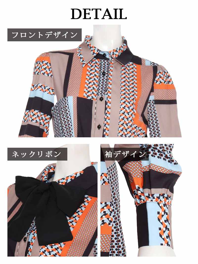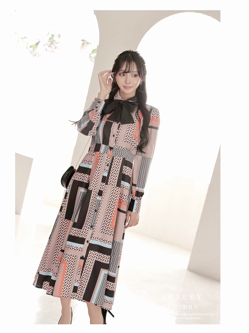 ワンピース キャバドレス ワンピース ロング 長袖 ジオメトリック ボウタイ DaysPiece(S/M/L/XL)(ブラック)