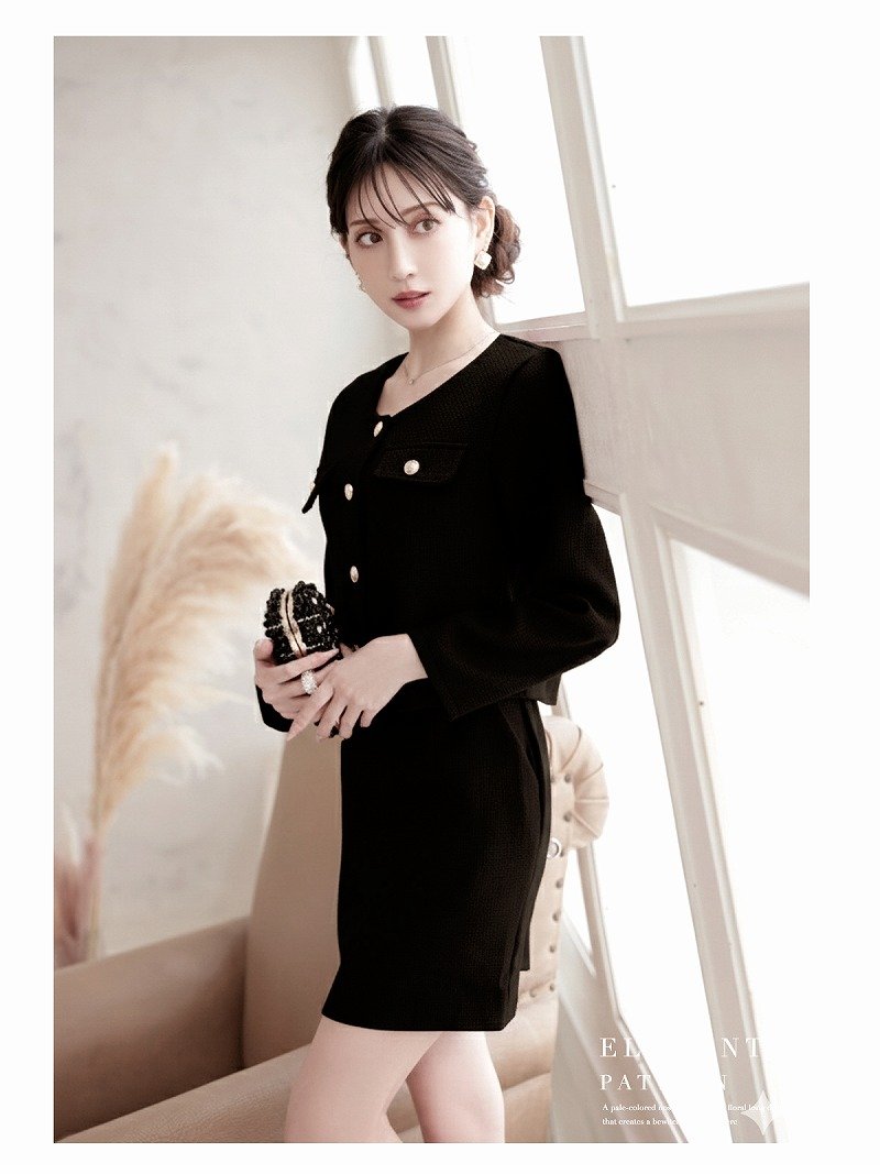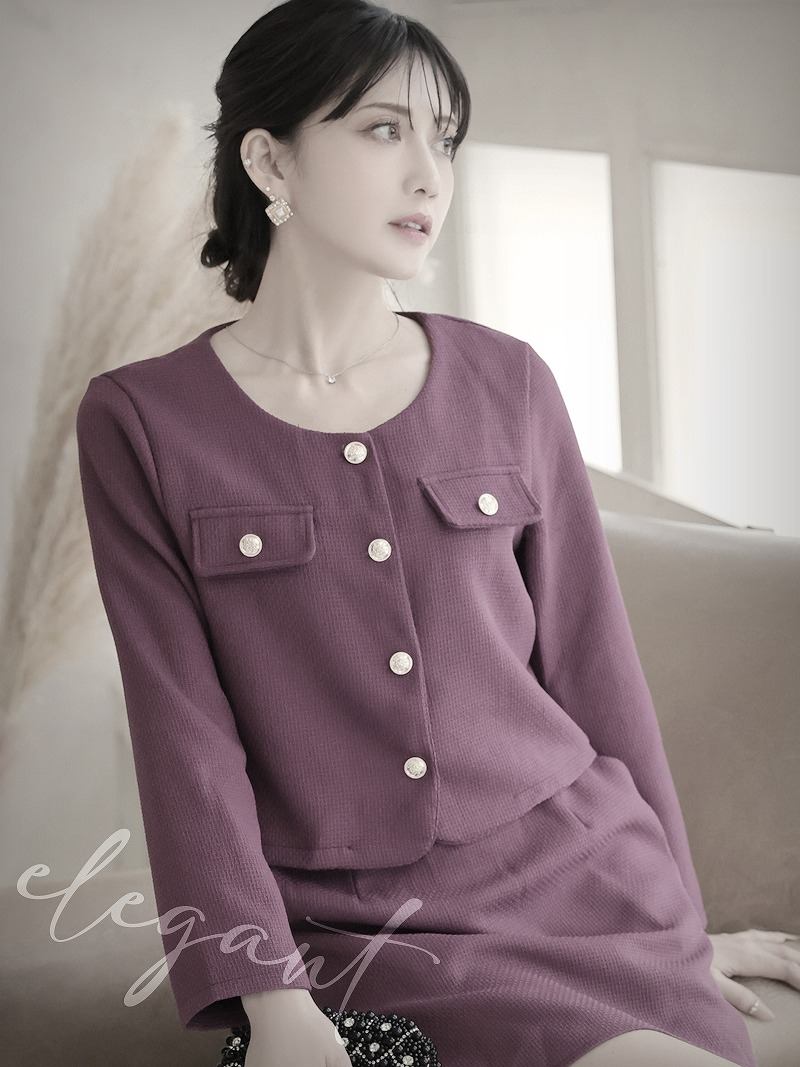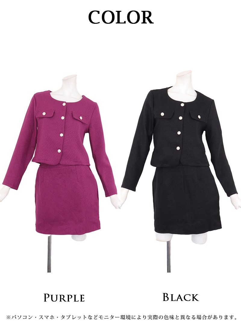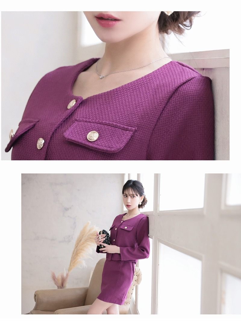 キャバスーツ セットアップ ツイード ノーカラー ゴールドボタン 長袖 Belsia(M/L/XL(2L)/XXL(3L))(パープル/ブラック) [510147]