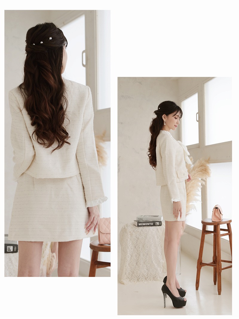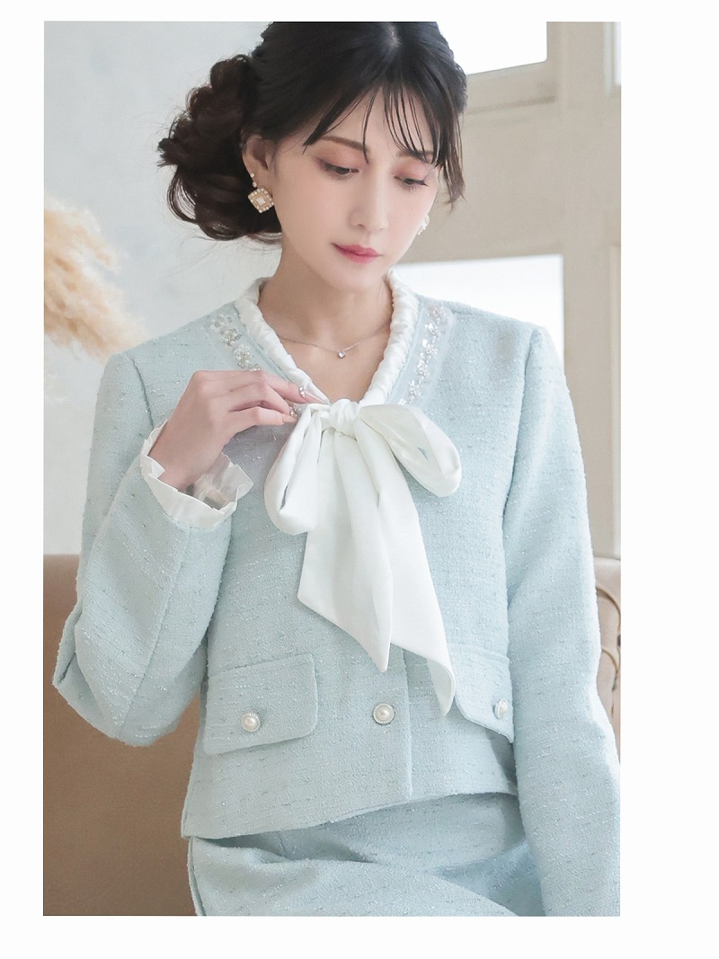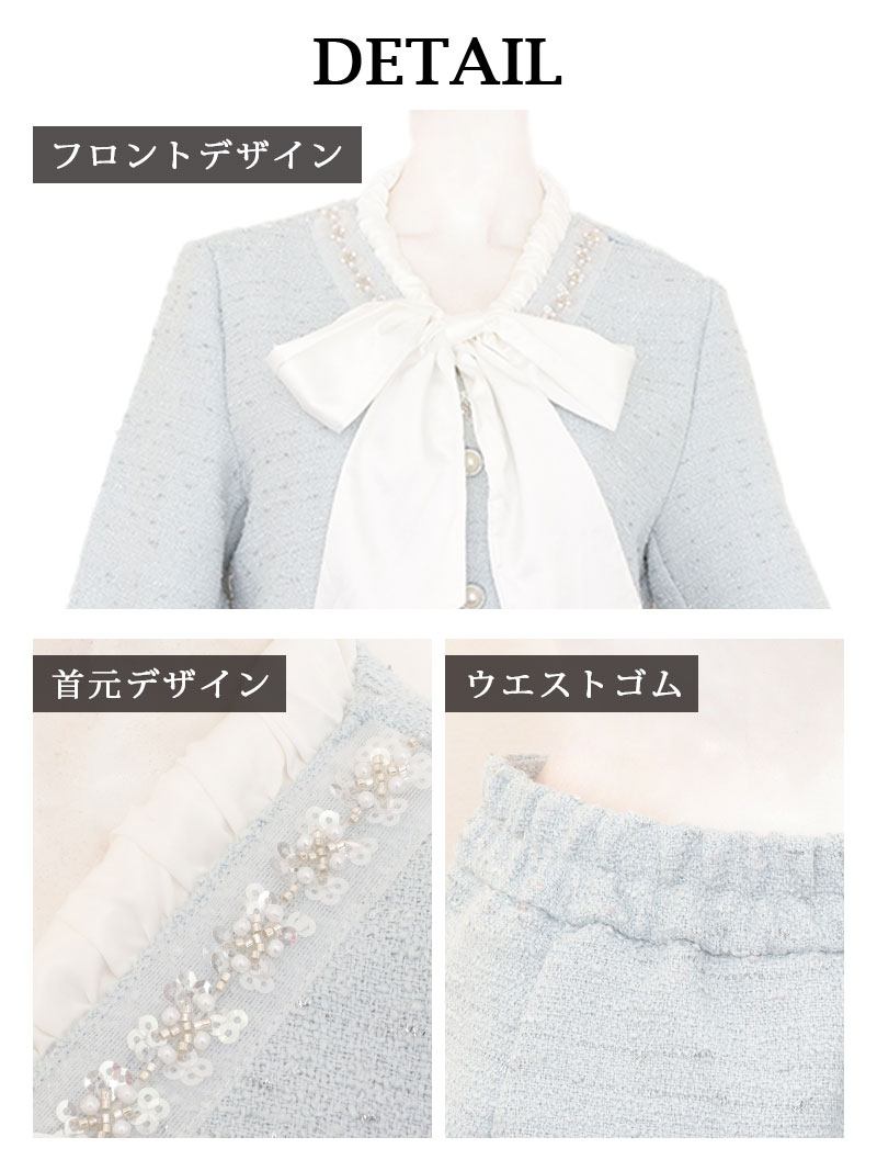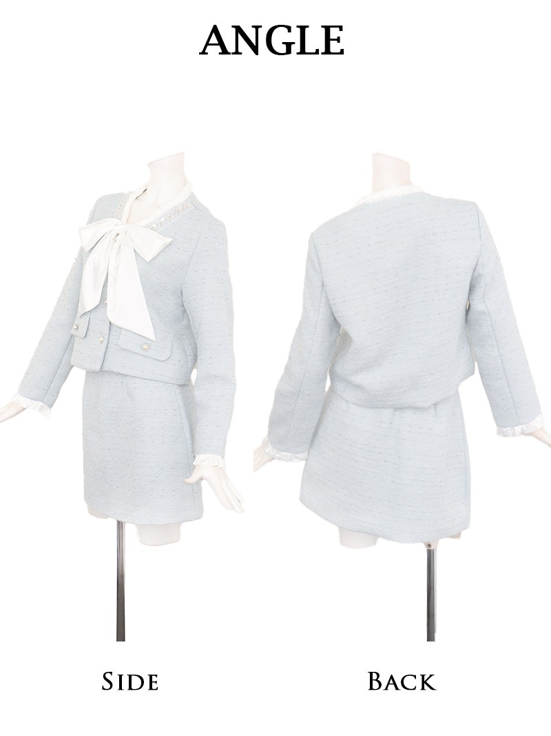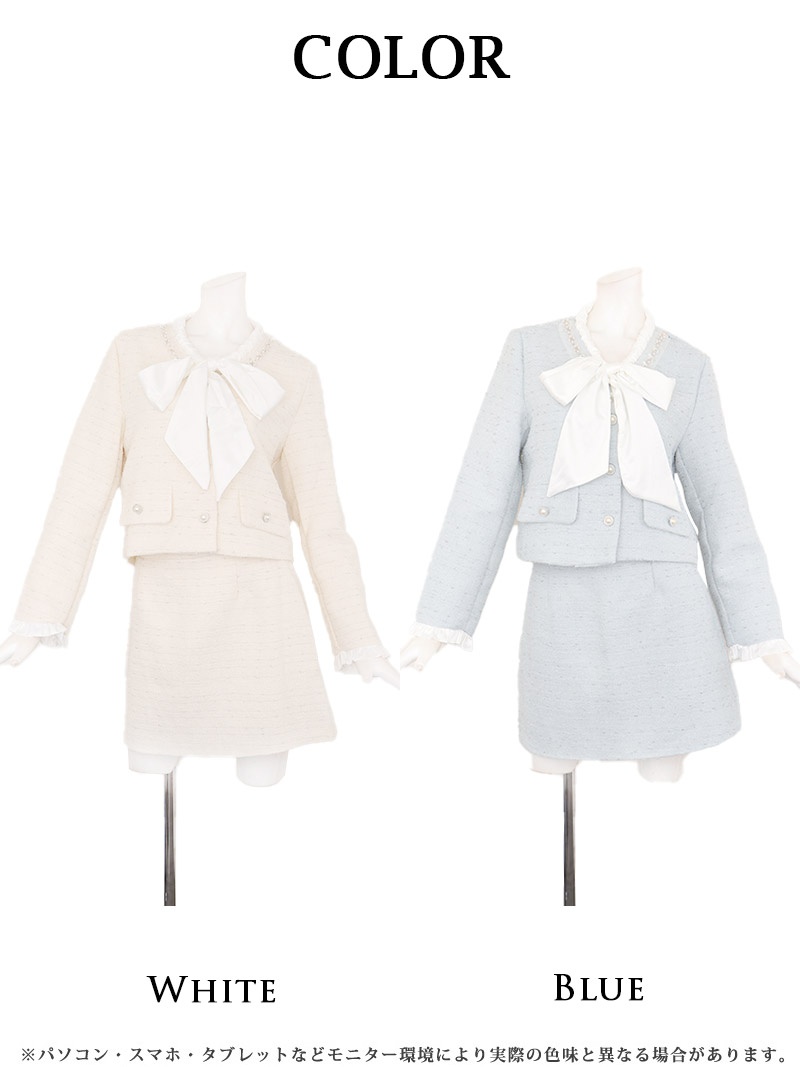 キャバスーツ ボウタイリボン ラメ入り ツイード フォーマル 式スーツ Belsia(S/M/L/XL(2L))(ホワイト/ブルー) [510203]