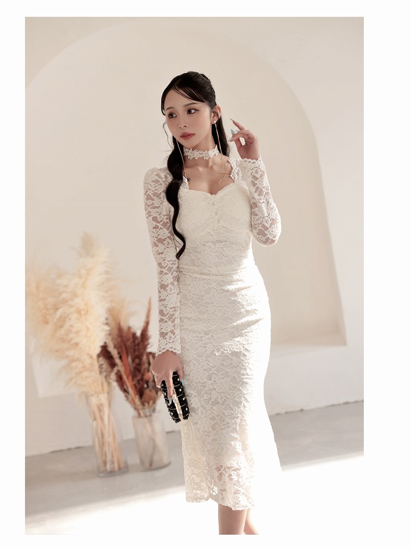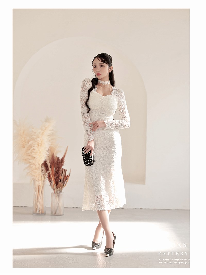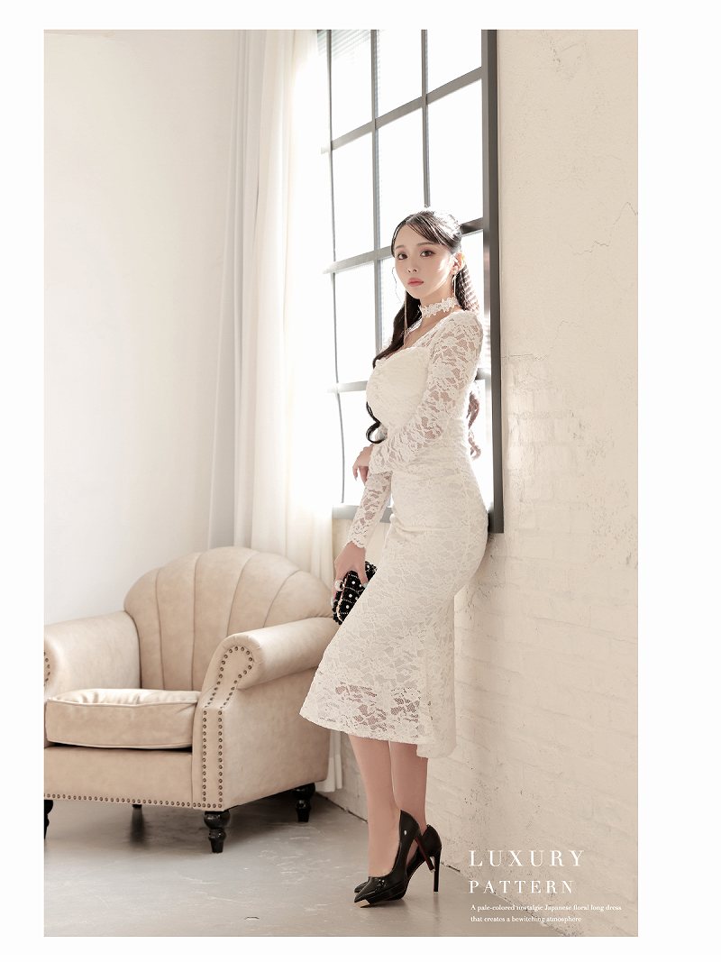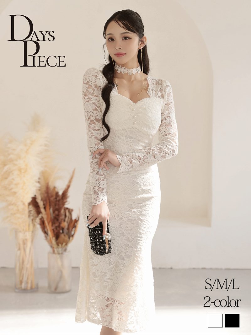 ワンピース キャバドレス 総レース 長袖 チョーカー付き ロングワンピース 韓国風 DaysPiece(S/M/L)(オフホワイト/ブラック) [510128]