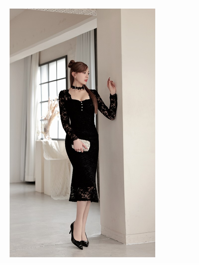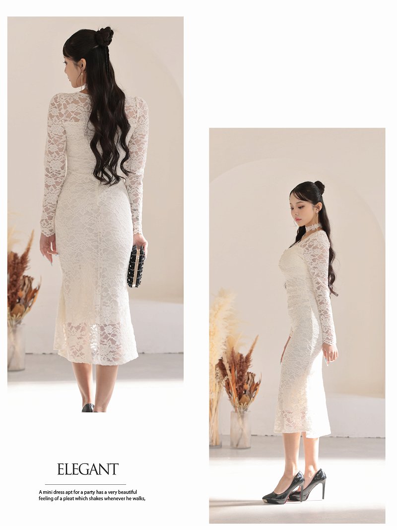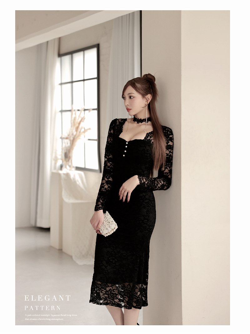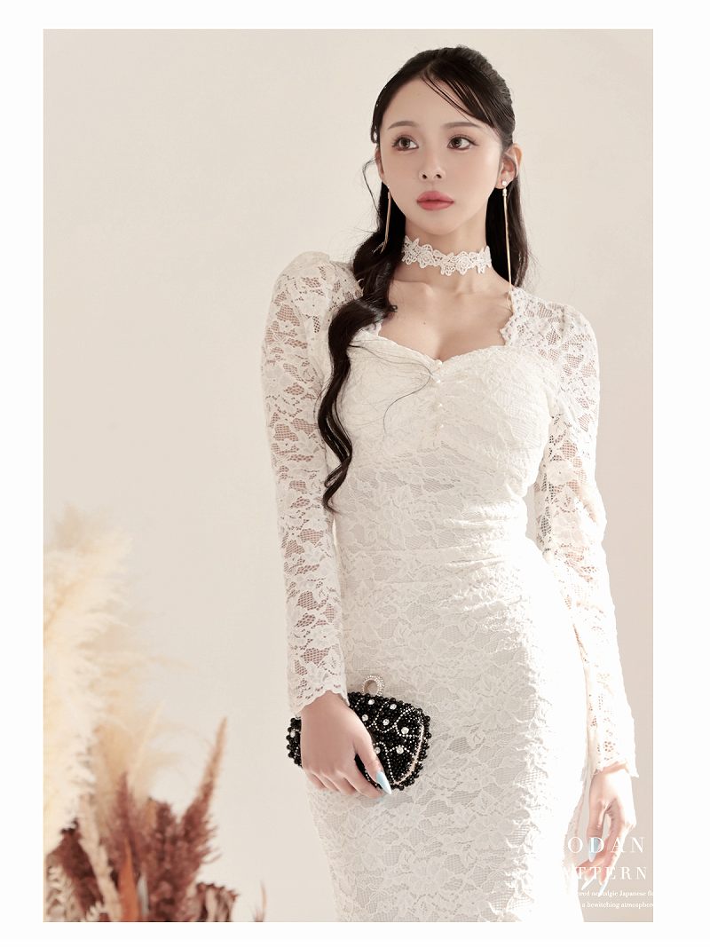 ワンピース キャバドレス 総レース 長袖 チョーカー付き ロングワンピース 韓国風 DaysPiece(S/M/L)(オフホワイト/ブラック) [510128]