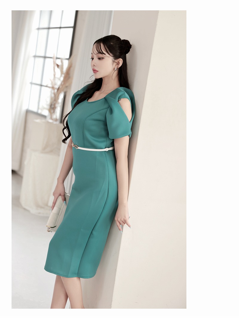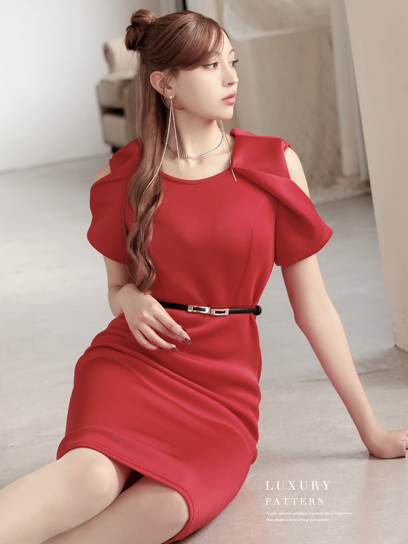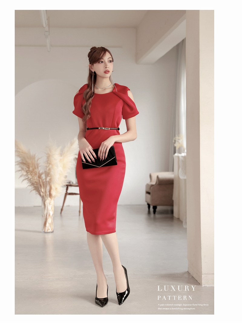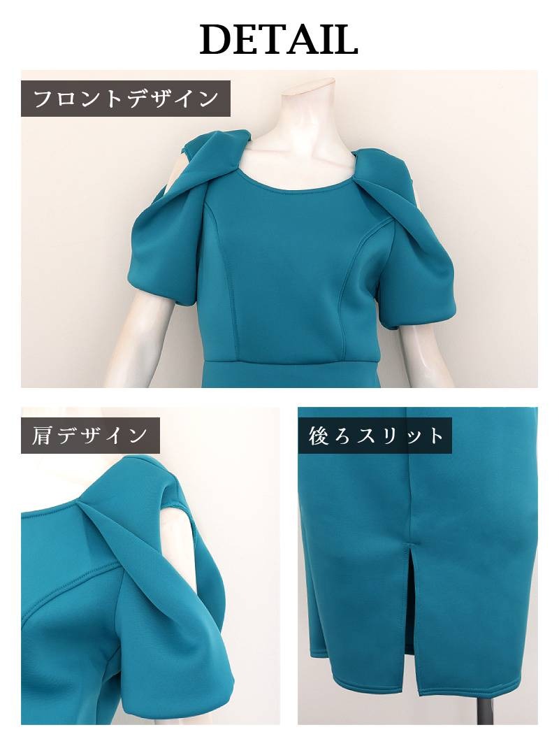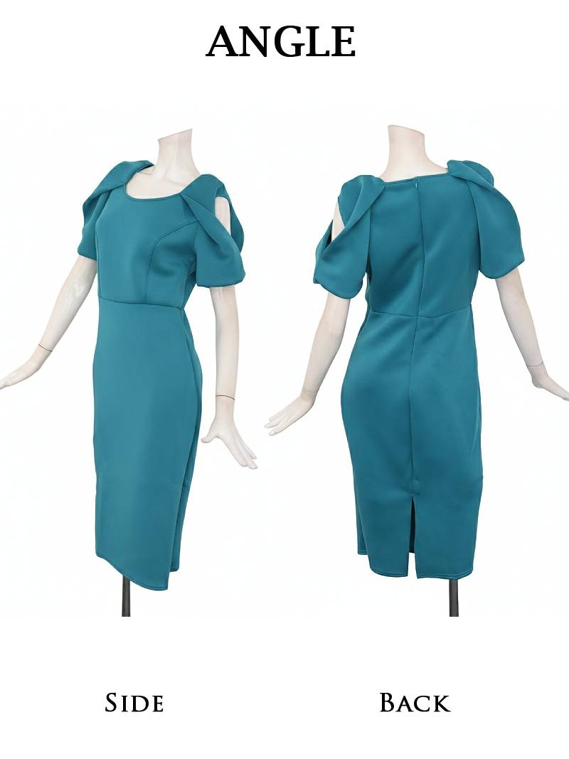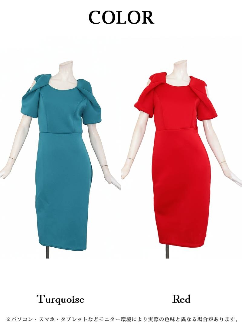 ワンピース キャバドレス カットショルダー 袖付き 厚手 ストレッチ 足長 DaysPiece(S/M/L/XL(2L)/XXL(3L))(レッド/ターコイズ) [510205]