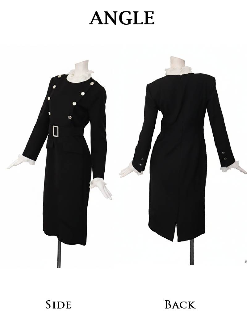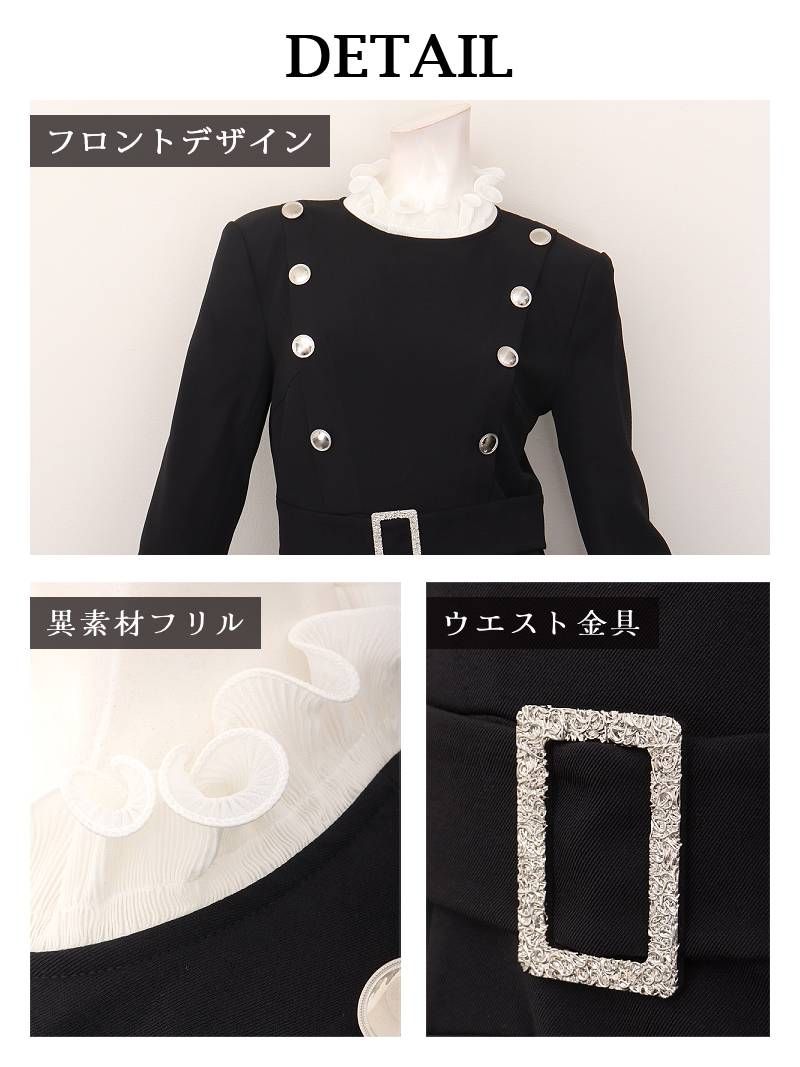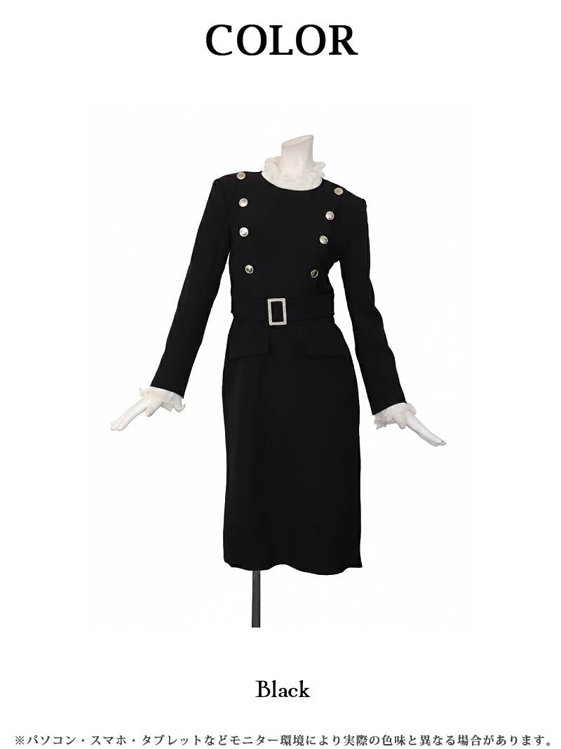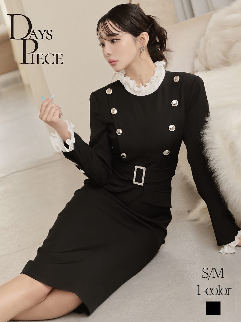 ワンピース キャバドレス レイヤード風 アコーディオンプリーツのフリルが上品 高級 ダブルボタン フェイクベルト付き DaysPiece(S/M)(ブラック) [510230]
