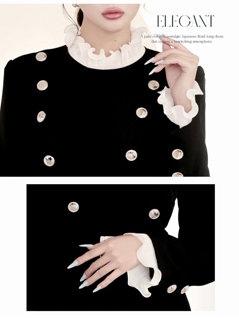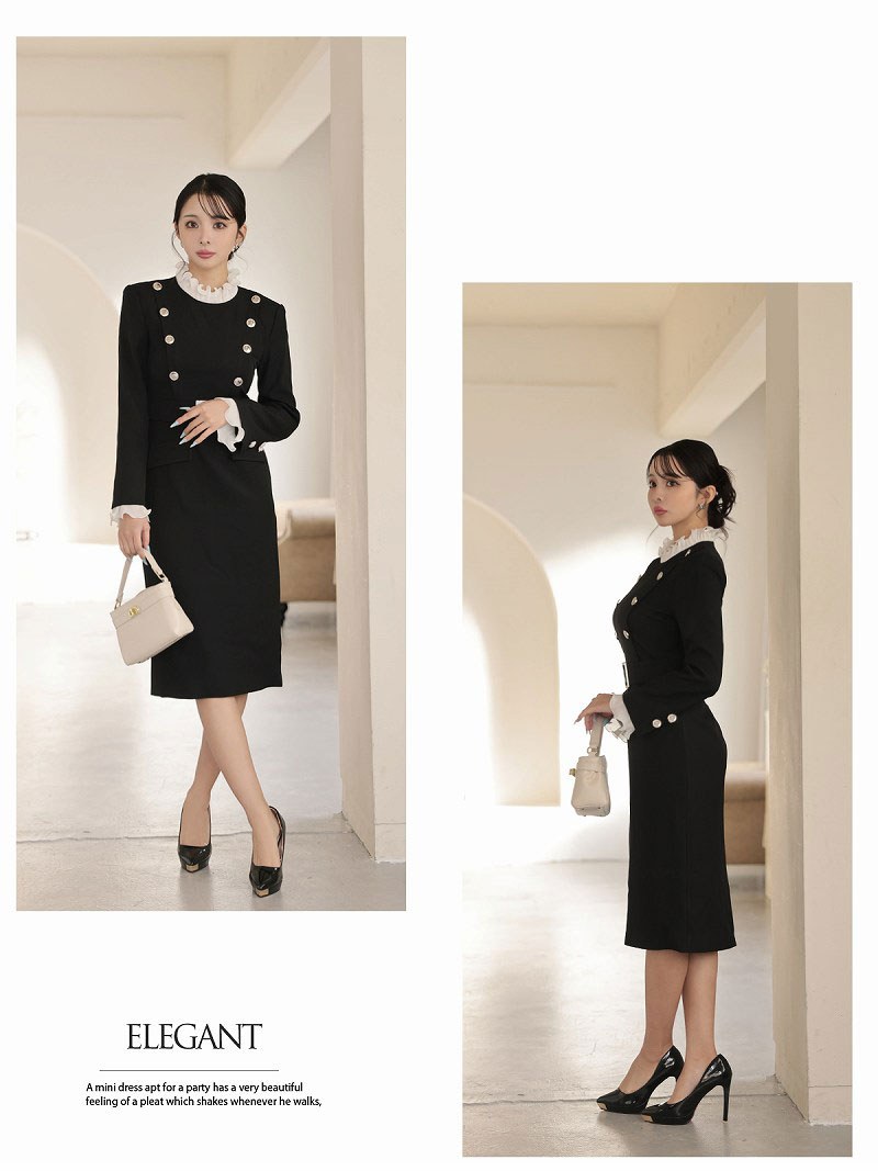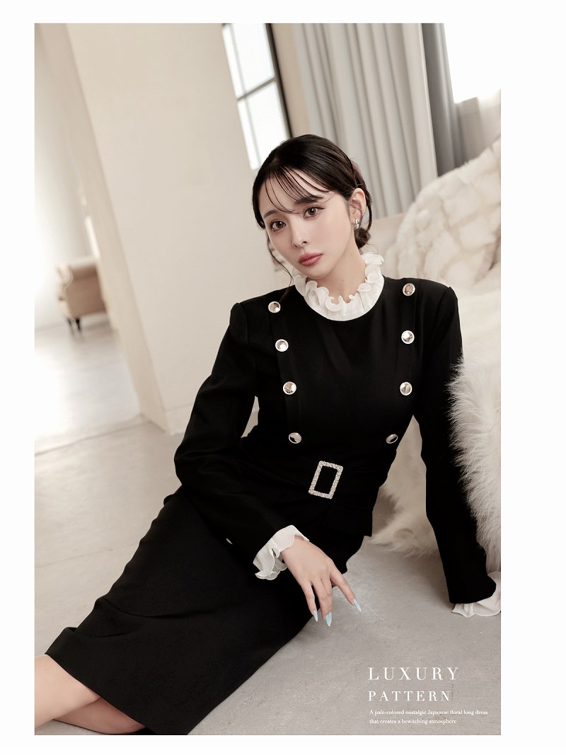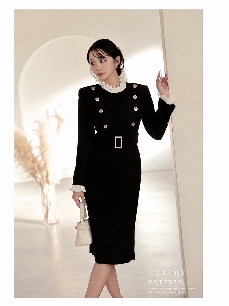 ワンピース キャバドレス レイヤード風 アコーディオンプリーツのフリルが上品 高級 ダブルボタン フェイクベルト付き DaysPiece(S/M)(ブラック) [510230]