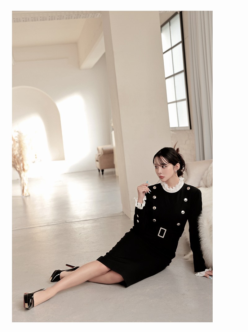 ワンピース キャバドレス レイヤード風 アコーディオンプリーツのフリルが上品 高級 ダブルボタン フェイクベルト付き DaysPiece(S/M)(ブラック)