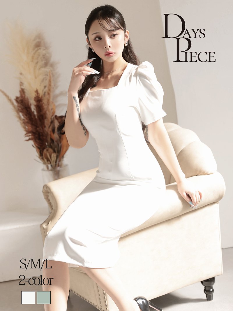 ワンピース キャバドレス 韓国風 ミディ丈 パフ袖 美デコルテ 二の腕細見せ DaysPiece(S/M/L)(ホワイト/グリーン) [510257]