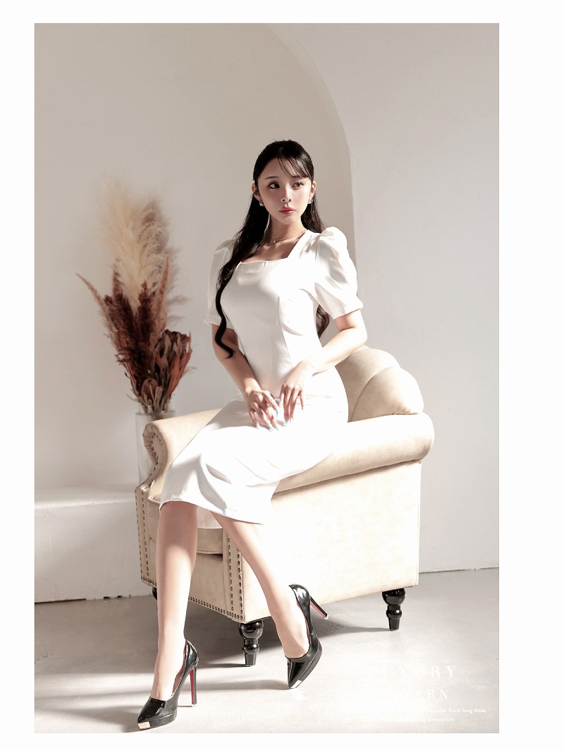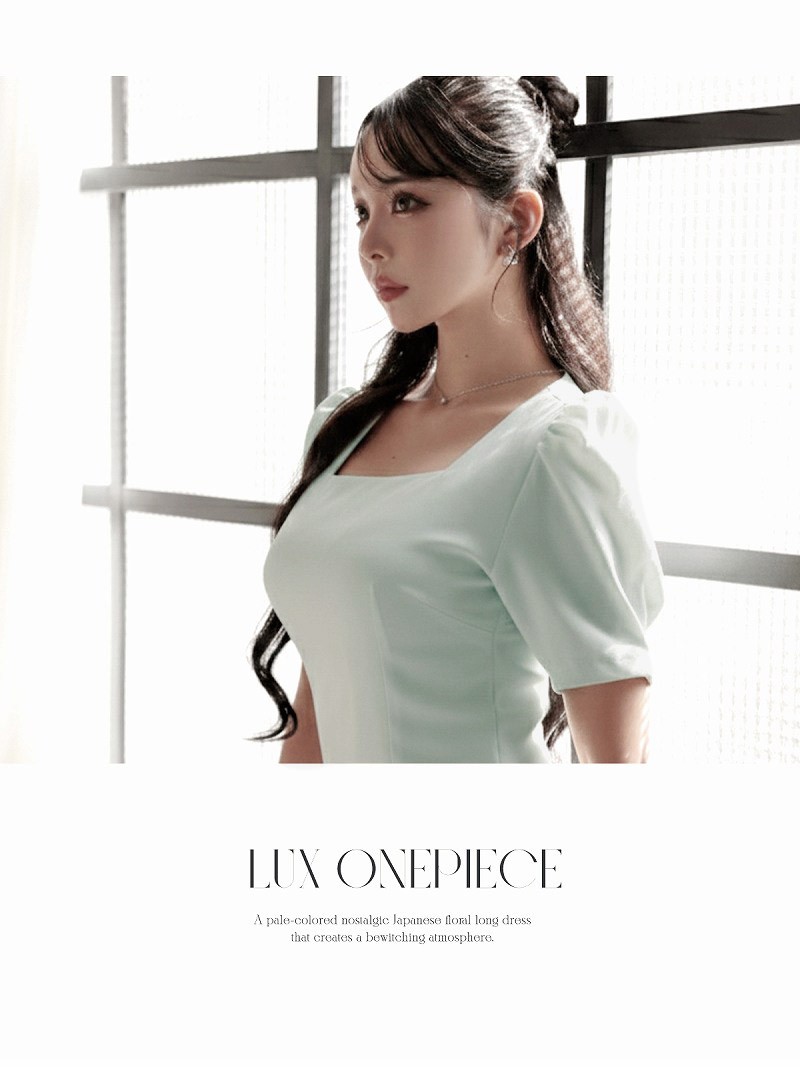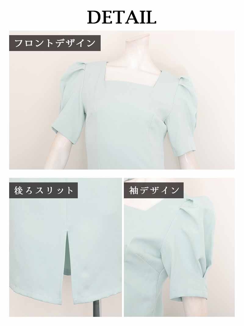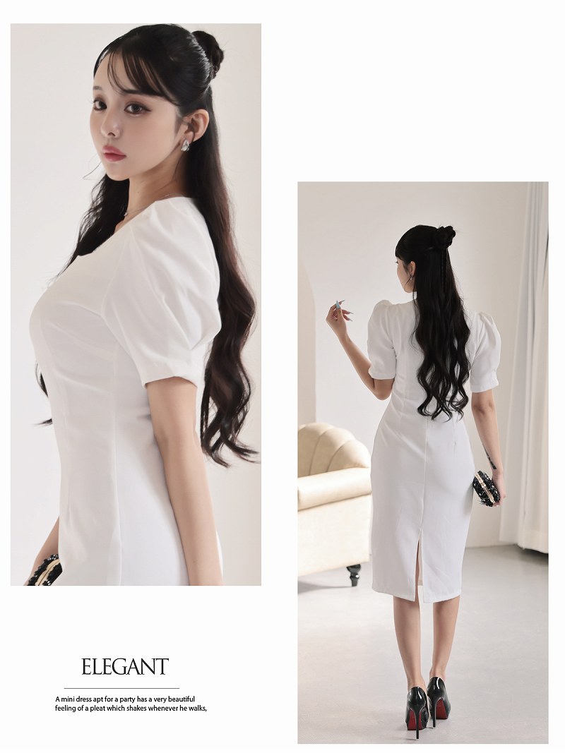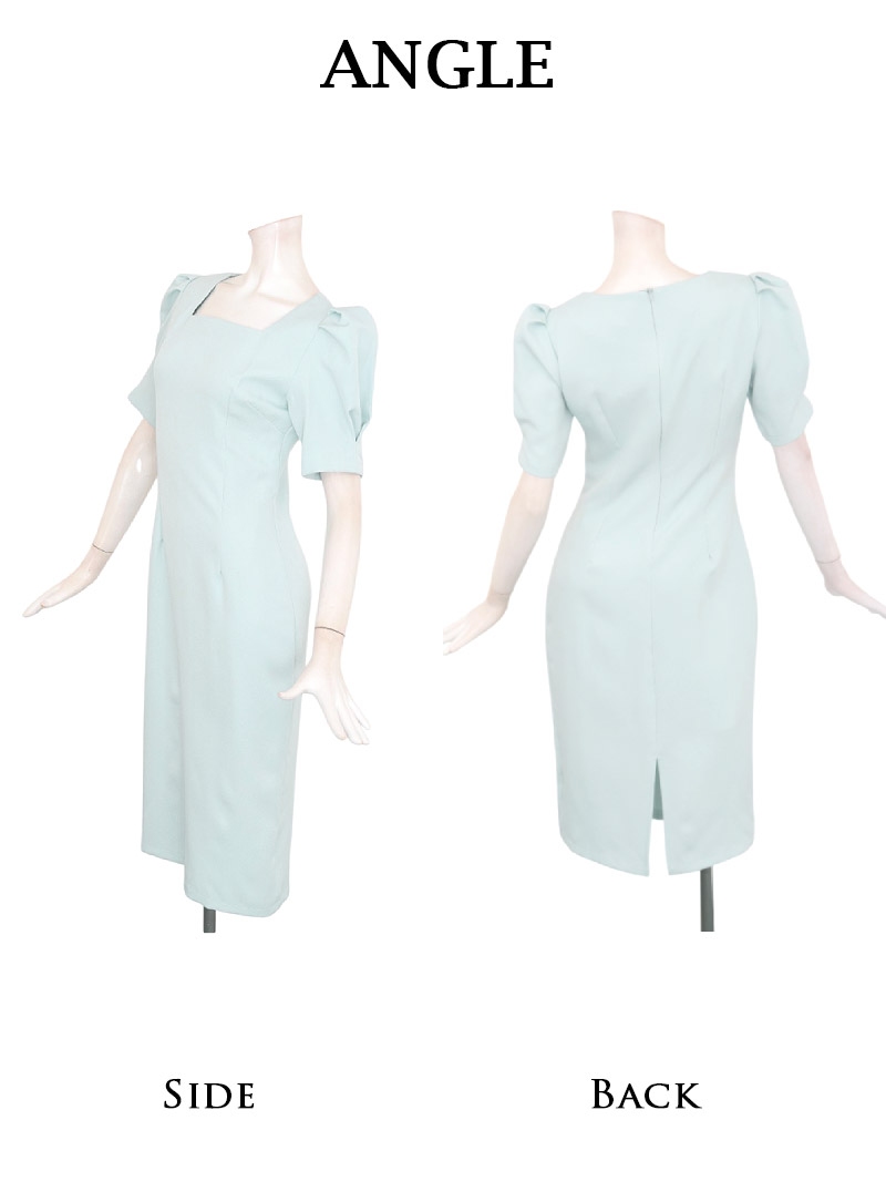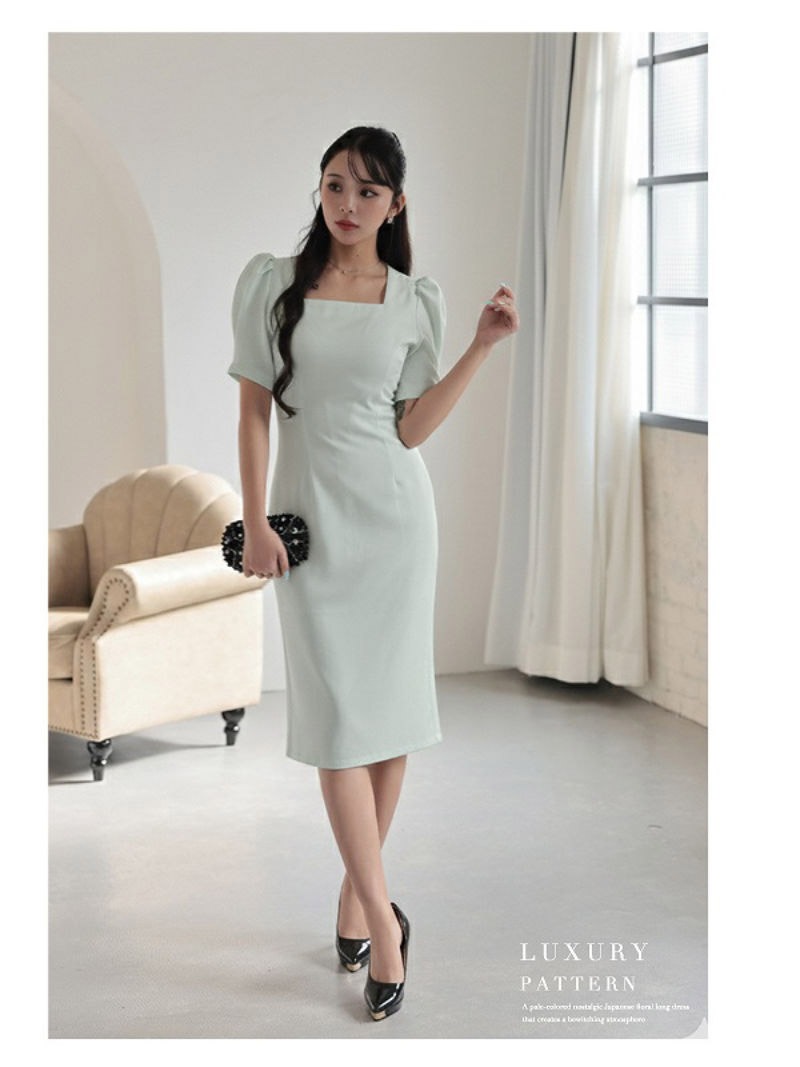 ワンピース キャバドレス 韓国風 ミディ丈 パフ袖 美デコルテ 二の腕細見せ DaysPiece(S/M/L)(ホワイト/グリーン)