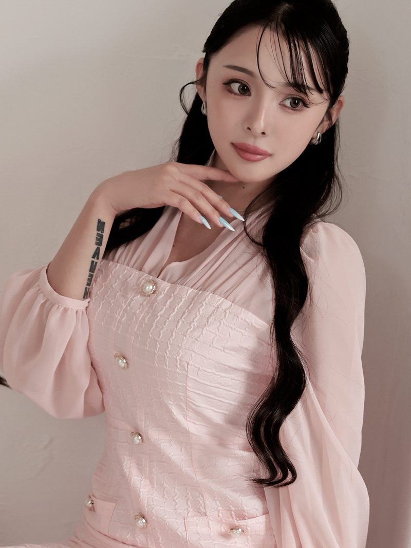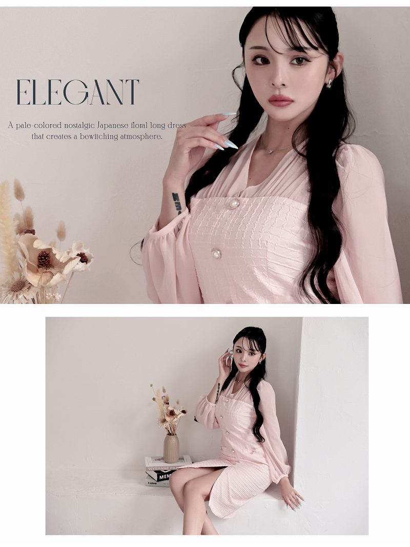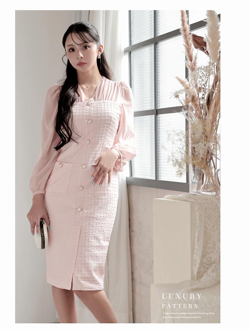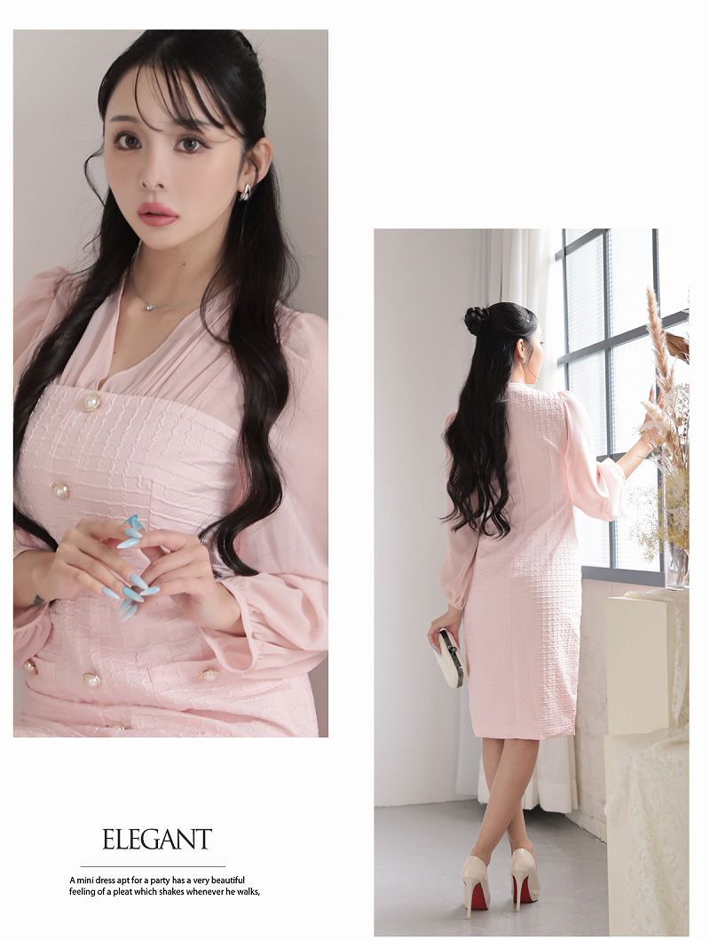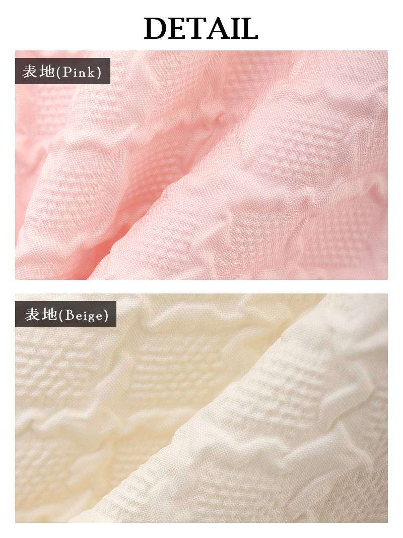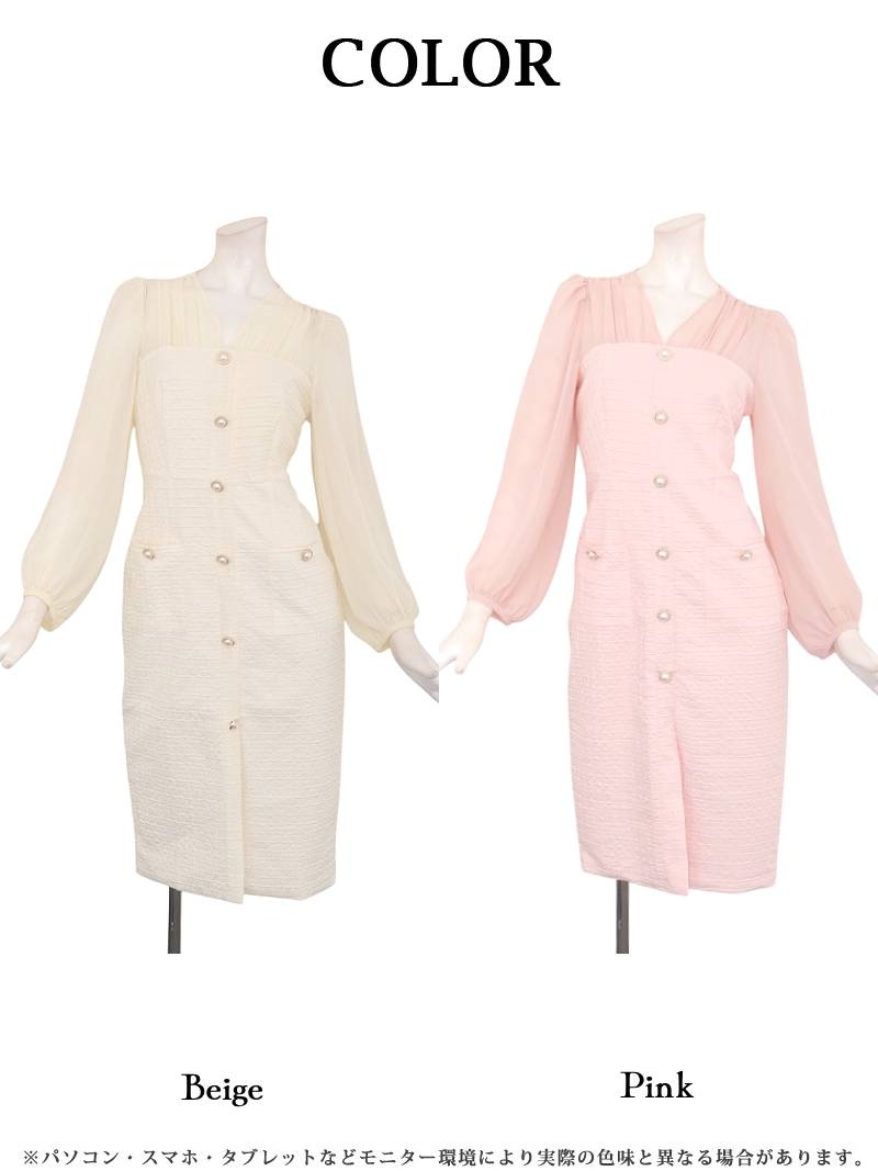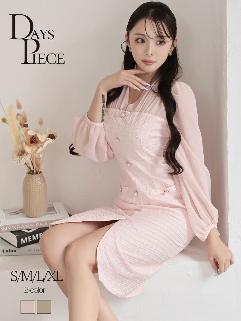 ワンピース キャバドレス 韓国風 ワッフル生地 シフォン袖 ボリューム袖 ウエストくびれ DaysPiece(S/M/L/XL(2L))(ピンク/ベージュ) [510275]